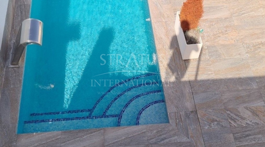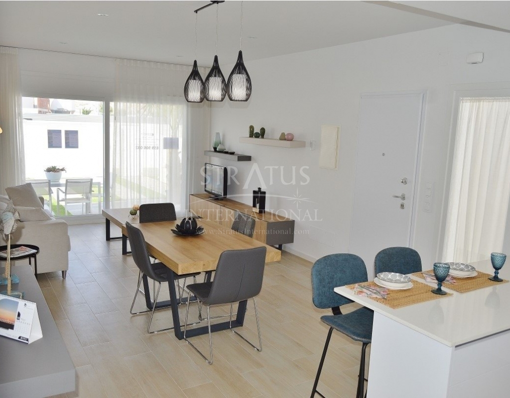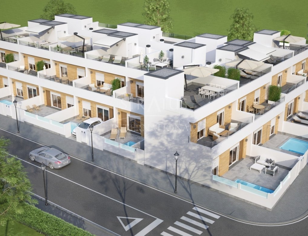 ADOSADOS DE OBRA NUEVA EN AVILESES Complejo residencial de 14 adosados en Avileses, Murcia. Los adosados cuentan con diferentes zonas de terrazas y amplio solarium, lo que permite disfrutar de todas las horas de sol todos los días del año, con piscina privada y aparcamiento en la parcela. Cada vivienda dispone de 3 dormitorios y 2 baños. Las propiedades han sido diseñadas en tres niveles con un estilo contemporáneo y un concepto abierto, que comprende una cocina totalmente equipada y un salón-comedor. Las propiedades cumplirán con los más altos estándares y estarán equipadas con: Piscina privada . Cocina completamente amueblada y equipada con electrodomésticos Balay: placa vitrocerámica, horno y microondas en la parte superior, campana extractora, nevera integrada y lavavajillas. Cuartos de baño totalmente equipados con: inodoro suspendido, mueble de tocador, espejo y columna de ducha de lluvia. Armarios forrados con cajones. Iluminación interior en cocina, salón, pasillo y baños con focos led. Focos led integrados en la pared del jardín y solarium. Preinstalación de aire acondicionado. La promoción se encuentra en Avileses (Murcia), rodeada de todos los servicios e instalaciones deportivas, cerca de varios campos de golf como La Torre Golf y Hacienda Riquelme, además de estar a 20 minutos en coche del aeropuerto de Murcia y a 15 minutos del Mar Menor y las playas del Mediterráneo.Especificaciones