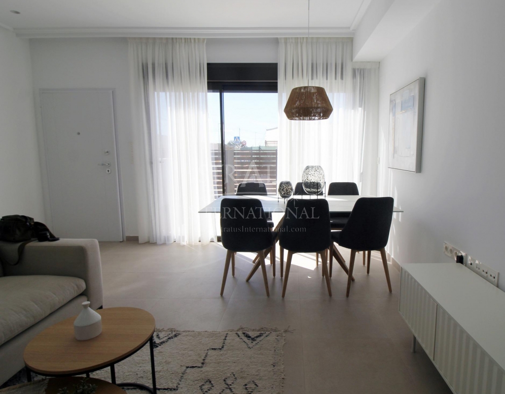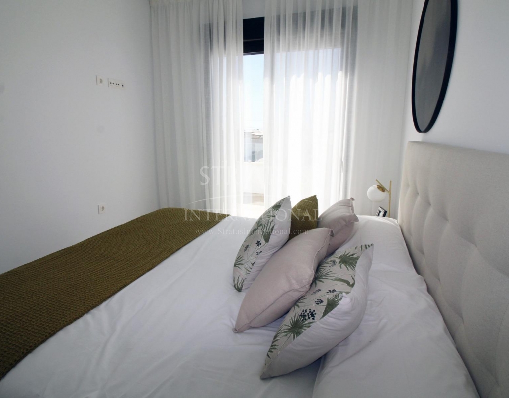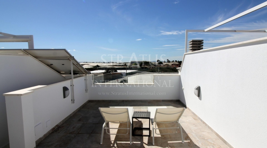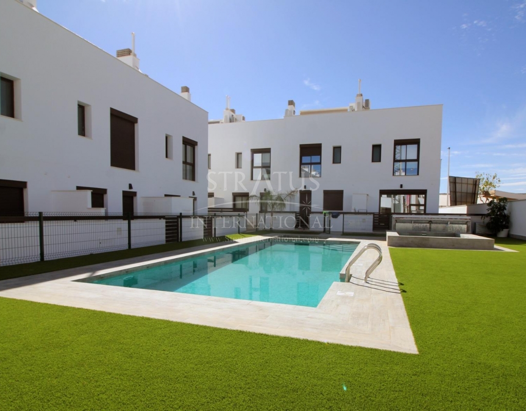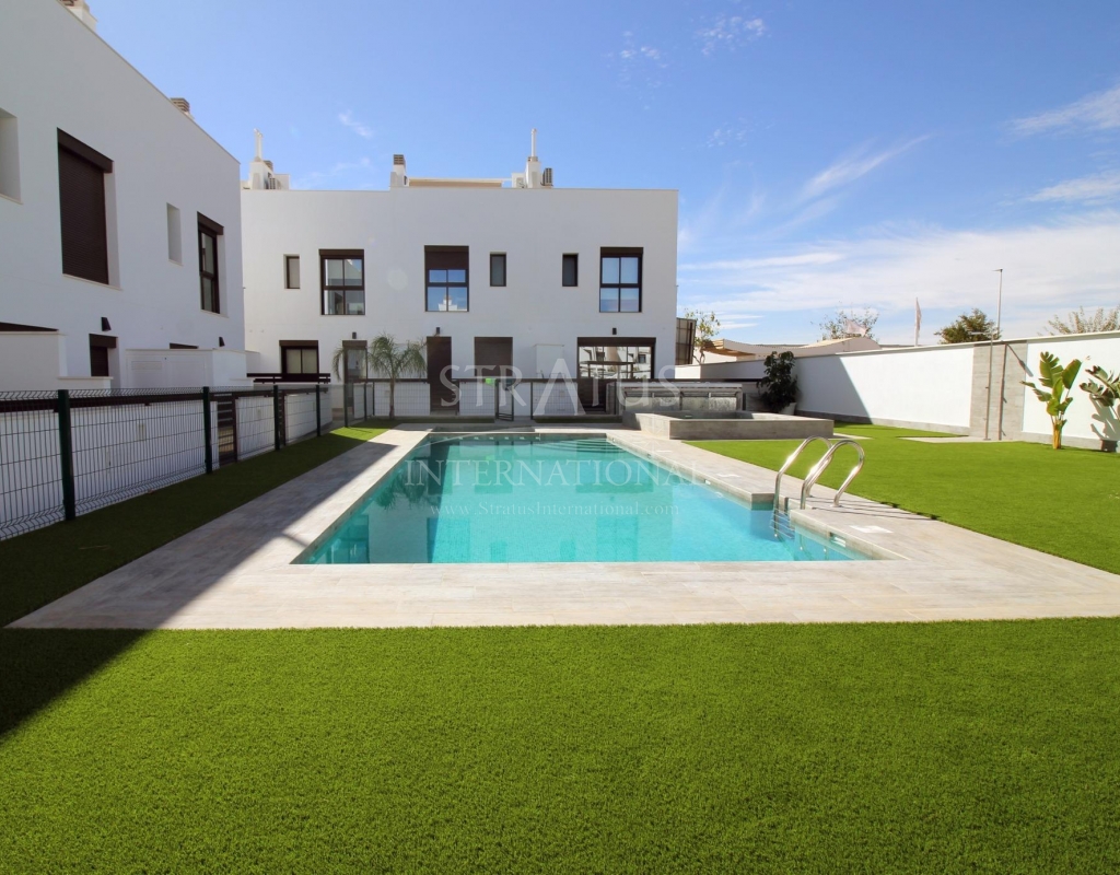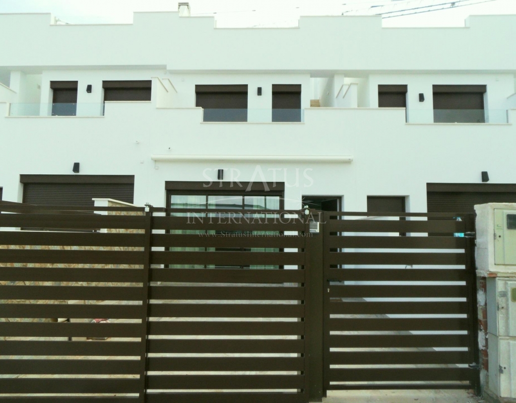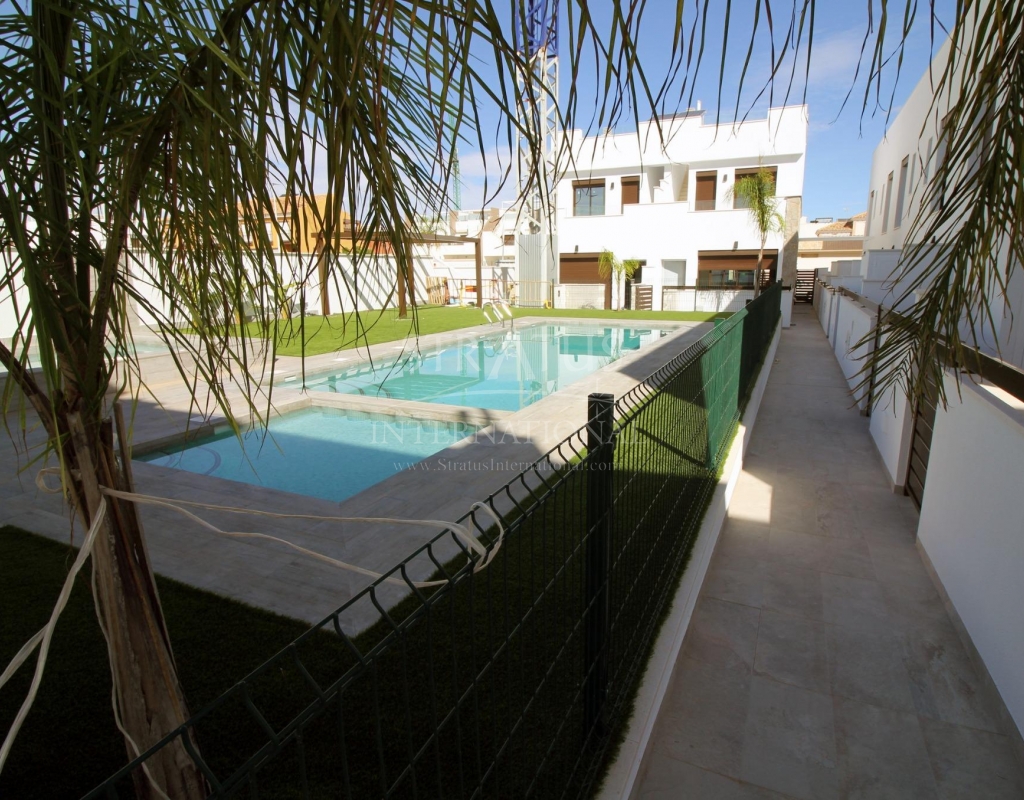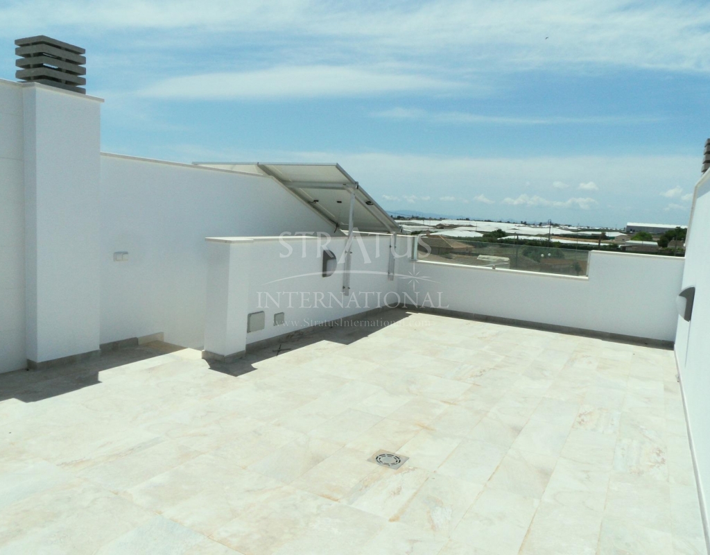 PAREADO DE OBRA NUEVA EN PILAR DE LA HORADADA Adosados y pareados modernos de nueva construcción en una zona tranquila de Pilar de la Horadada con proximidad a todo lo que necesitas. Viviendas tienen 3 dormitorios, 2 baños, cocina abierta, salón con acceso directo a la acogedora zona de la piscina, terraza en la parte trasera con plaza de aparcamiento, terraza y gran solarium en la azotea. Pilar de la Horadada es un típico pueblo español en la parte más meridional de la Costa Blanca. La gran calle principal tiene supermercados, muchas tiendas, restaurantes y bares y algunas plazas encantadoras. Las hermosas playas de Torre de la Horadada y Mil Palmeras con arena fina y paseo marítimo está a sólo 5 minutos. Los aeropuertos de Corvera (Murcia) y Alicante están a 40 y 55 minutos respectivamente.