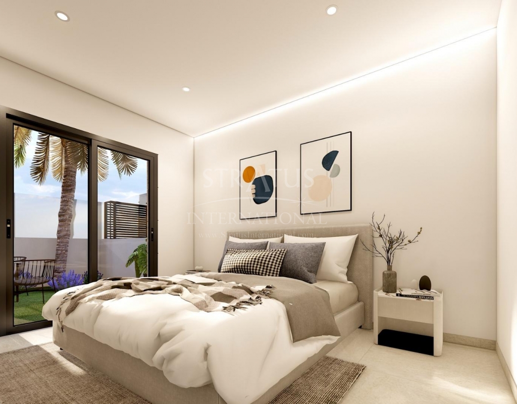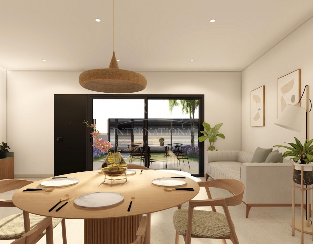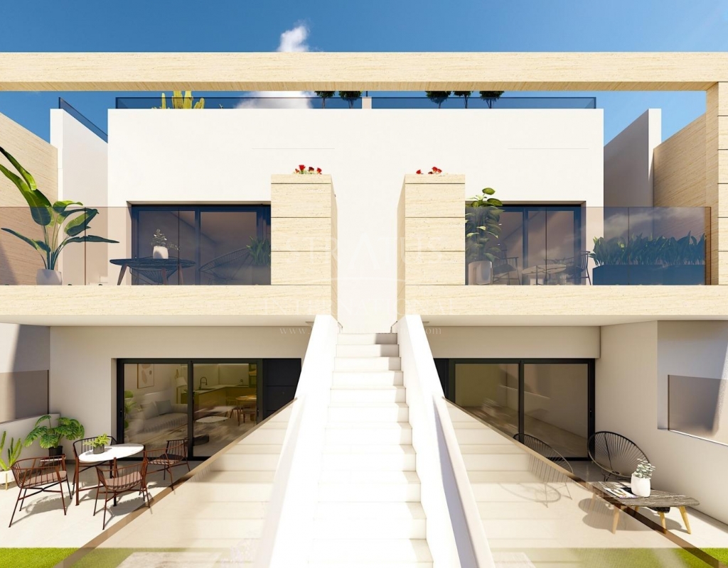 Bungalows de nueva construcción en Lo Pagán: Vida Moderna Cerca de la Playa Ubicación privilegiada en Lo Pagán, San Pedro del Pinatar Descubra el estilo de vida costero perfecto con estos bungalows de nueva construcción en Lo Pagán, una encantadora zona de San Pedro del Pinatar. Situado a sólo 1,2 km de la hermosa Playa de Villa Nanitos, estás a 15 minutos a pie de playas de arena y del icónico Molino Quintín. Esta ubicación privilegiada es perfecta para los amantes de la playa y los deportes náuticos, con clubes náuticos y puertos deportivos en las inmediaciones. Además, todos los servicios esenciales como supermercados, bares y restaurantes están a sólo unos minutos a pie. Características Estos elegantes bungalows disponen de 2 dormitorios, 2 baños, cocina americana y sala de estar. Los bungalows disponen de preinstalación de aire acondicionado, armarios empotrados e interiores modernos. Las unidades de la planta baja cuentan con una amplia terraza con la opción de añadir una piscina privada (disponible a un coste adicional), mientras que las unidades de la planta superior cuentan con un solarium privado con piscina incluida, perfecto para relajarse bajo el sol mediterráneo. Acabados de alta calidad Cada bungalow incluye una plaza de aparcamiento, y todos los apartamentos tienen acabados de alta calidad. Las características incluyen electrodomésticos de cocina Bosch, persianas eléctricas, pre instalación de aire acondicionado por conductos, baños totalmente equipados e iluminación LED tanto en el interior como en el exterior. Ideal para vivir todo el año Lo Pagán ofrece un estilo de vida tranquilo con una comunidad acogedora y establecida. Los residentes pueden disfrutar de actividades durante todo el año gracias al suave clima invernal de la región. La zona cuenta con piscinas cubiertas, instalaciones deportivas y una gran variedad de eventos sociales. Los baños de barro natural y las tranquilas aguas del Mar Menor contribuyen a su atractivo, convirtiéndolo en un destino privilegiado para el bienestar y la relajación. Atracciones cercanas Centro Comercial Dos Mares: 5 minutos en coche Aeropuerto de Murcia (Corvera): 30 minutos en coche Aeropuerto de Alicante: 1 hora en coche Los campos de golf y los puertos deportivos se encuentran a poca distancia en coche, lo que la convierte en una ubicación excelente tanto para el ocio como para la comodidad.Especificaciones
