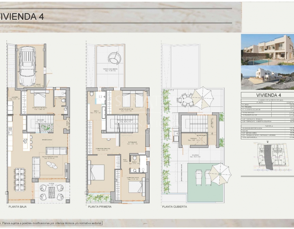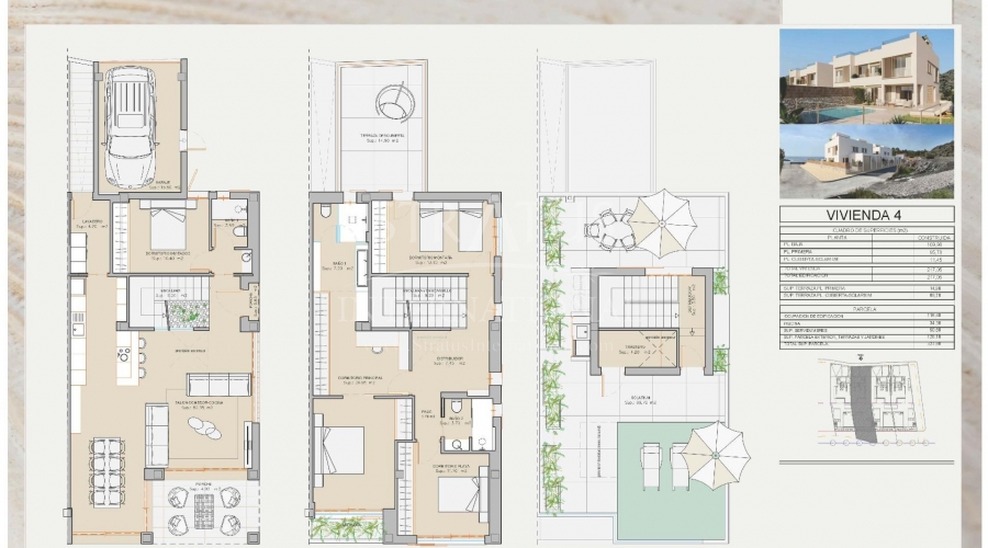 Villas adosadas de lujo frente al mar en Cala Panizo, Cuevas de Almanzora, Almería Vida exclusiva en primera línea de playa Experimente el auténtico lujo mediterráneo con esta exclusiva colección de 6 villas adosadas de primera calidad situadas en primera línea de playa en Cala Panizo, en Cuevas de Almanzora, Almería. Diseñadas para aquellos que valoran el estilo de vida, la serenidad y la conexión directa con el mar, estas viviendas ofrecen un entorno incomparable donde el sonido de las olas y las vistas panorámicas al mar se convierten en parte de la vida cotidiana. Arquitectura moderna y características premium Cada villa cuenta con 4 dormitorios y 3 baños en amplias parcelas de más de 300 m². La arquitectura combina el diseño mediterráneo moderno con la funcionalidad, ofreciendo interiores elegantes, espacios abiertos y luminosos y acabados de alta calidad en todas las estancias. La planta baja incluye un garaje privado cerrado, zona de lavandería, un amplio salón con cocina abierta, acceso directo a un porche cubierto y un bonito jardín delantero con una piscina infinita con vistas al mar. También hay un dormitorio y un cuarto de baño en esta planta, ideal para invitados o para una vida flexible. La primera planta ofrece tres dormitorios adicionales y dos baños, uno de ellos en suite. El solárium de la azotea, de 69 m², ofrece espacio para una cocina de verano y la preinstalación de un jacuzzi, creando un entorno perfecto para disfrutar de las puestas de sol y relajarse en privado. Las viviendas están preparadas para la instalación de un ascensor bajo petición. Las cocinas totalmente equipadas con electrodomésticos, los baños completos, el aire acondicionado por conductos con sistema de alta eficiencia y los refinados materiales interiores garantizan el confort y la comodidad durante todo el año. Prestigiosa ubicación costera Cala Panizo es una tranquila zona residencial costera conocida por sus aguas cristalinas, sus pequeñas calas y su belleza natural. La urbanización se encuentra justo al sur de Pozo del Esparto y muy cerca de Mar de Pulpi, San Juan de los Terreros y Aguilon Golf. La encantadora ciudad de Águilas, con su puerto deportivo, servicios y restaurantes, también se encuentra cerca. Distancias clave Mar de Pulpi: 6 km San Juan de los Terreros: 8 km Puerto deportivo de Águilas: 25 km Aguilon Golf: 10 km Aeropuerto de Almería: aprox. 100 km Aeropuerto de Murcia: aprox. 120 km Aeropuerto de Alicante: aprox. 180 km Descubra su estilo de vida frente al mar Disfrute de privacidad, lujo y acceso directo al Mediterráneo en un entorno diseñado para la comodidad y la relajación. Póngase en contacto con nosotros hoy mismo para conocer la disponibilidad, los precios y concertar una visita a estas exclusivas villas frente al mar en Cala Panizo.Especificaciones