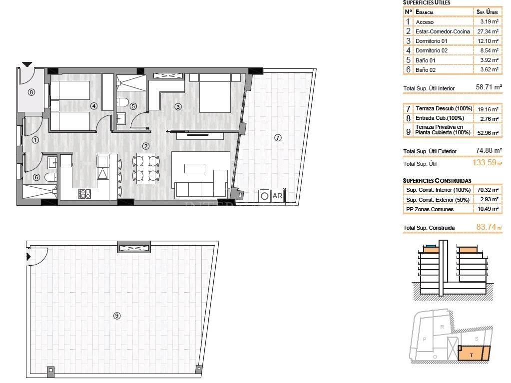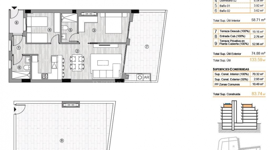 Apartamentos de nueva construcción en el corazón de Torrevieja A solo 400 m de la Playa del Cura Ubicación privilegiada en el centro de Torrevieja Este nuevo edificio residencial goza de una ubicación inmejorable en el centro de Torrevieja, a solo 400 m de la Playa del Cura. Rodeado de tiendas, supermercados, restaurantes y servicios cotidianos, ofrece todo lo necesario a poca distancia. La zona también cuenta con parques, zonas de ocio y áreas verdes, creando un equilibrio perfecto entre las comodidades urbanas y los momentos de relax. Viviendas modernas de 2 y 3 dormitorios La promoción ofrece una selección de apartamentos de 2 y 3 dormitorios, incluyendo áticos, algunos de ellos con soláriums privados. Cada vivienda está diseñada con un estilo contemporáneo, con distribuciones diáfanas, amplias terrazas y cocinas integradas de estilo americano. Los baños están totalmente equipados con muebles, mamparas de ducha y calefacción por suelo radiante. Las cocinas incluyen electrodomésticos y cada apartamento cuenta con preinstalación para aire acondicionado por conductos. Hay disponibles plazas de aparcamiento subterráneo y trasteros opcionales. Instalaciones de estilo resort para el bienestar Los residentes pueden disfrutar de una amplia gama de servicios exclusivos. La planta baja cuenta con un gimnasio totalmente equipado, ideal para el entrenamiento diario. El solárium de la azotea ofrece un auténtico oasis de relajación con tumbonas, sauna finlandesa y minipiscina. Tanto el ascensor como las escaleras conectan directamente con la azotea para ofrecer la máxima comodidad y accesibilidad. Vivir en un entorno natural y costero único Torrevieja es conocida por su cálido clima mediterráneo, con una temperatura media anual de 20 ºC, lo que la convierte en un lugar perfecto para vivir durante todo el año. La ciudad es famosa por sus lagunas salinas naturales y el Parque Natural protegido de La Mata y Torrevieja, situado a solo 4 km de la urbanización. Sus lagos rosados y verdes, sus pintorescas rutas de senderismo y su rica biodiversidad ofrecen un estilo de vida saludable e inspirador. Distancias a puntos de interés clave Playa del Cura 0,4 km Puerto deportivo de Torrevieja 1 km Parque Natural de La Mata 4 km Villamartin Golf 8 km Aeropuerto de Alicante 45 km Aeropuerto de Murcia 60 km Experimente el estilo de vida mediterráneo No pierda la oportunidad de adquirir una vivienda moderna en una de las ciudades costeras más deseadas de la Costa Blanca. Póngase en contacto con nosotros hoy mismo para concertar una visita y asegurarse su lugar en esta excepcional nueva promoción.Especificaciones