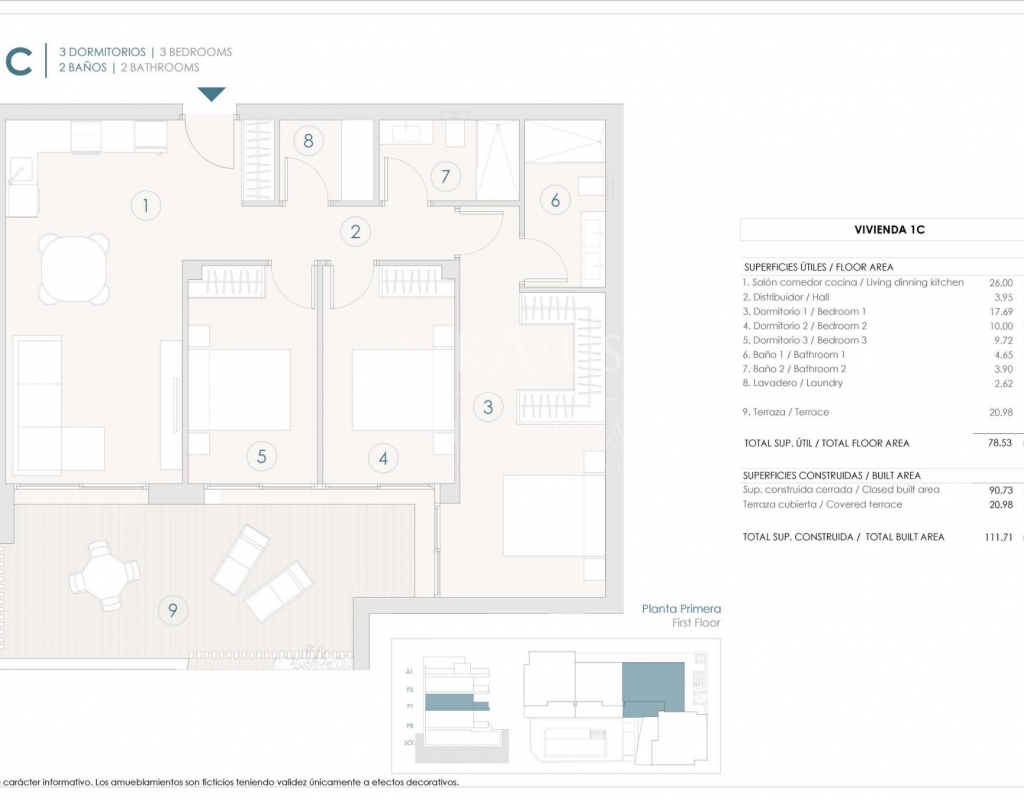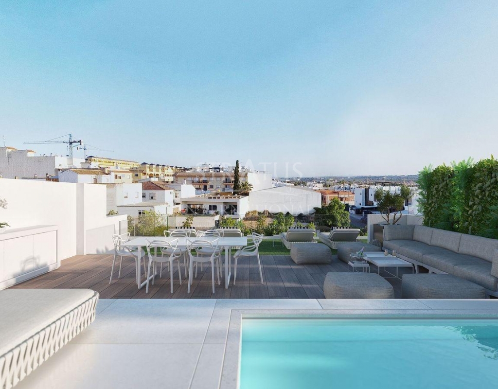 Apartamentos de nueva construcción en Benijófar con una ubicación céntrica Vida residencial contemporánea en Benijófar Esta exclusiva promoción nueva en Benijófar ofrece solo 11 viviendas modernas diseñadas para combinar arquitectura contemporánea, comodidad y materiales de alta calidad. El proyecto incluye apartamentos en planta baja y primera planta con amplias terrazas, así como áticos con terrazas y soláriums privados. Situada en una zona céntrica pero tranquila de Benijófar y frente a una gran zona verde, la urbanización disfruta de una excelente luz natural durante todo el día y de unas agradables vistas abiertas. Apartamentos modernos con características de primera calidad Cada propiedad ha sido cuidadosamente diseñada para cumplir con altos estándares de calidad y funcionalidad. Todas las viviendas incluyen una plaza de garaje privada y un trastero en el sótano, con cómodo acceso en ascensor. Los residentes también pueden disfrutar de una elegante piscina comunitaria rodeada de zonas comunes ajardinadas, ideal para relajarse y socializar. Los áticos destacan por sus amplios soláriums, que ofrecen la posibilidad de instalar una cocina al aire libre y cuentan con un jacuzzi, creando un espacio exterior único perfecto para entretenerse o relajarse bajo el sol del Mediterráneo. Acabados de alta calidad y eficiencia energética La residencia se ha construido prestando especial atención a la durabilidad, la eficiencia y la estética moderna. Las características incluyen: Preinstalación de aire acondicionado y calefacción por conductos Carpintería exterior con rotura de puente térmico y doble acristalamiento Sistema aerotérmico para agua caliente sanitaria Cocinas amuebladas con electrodomésticos incluidos Paquete de iluminación interior y exterior incluido Baños con tocadores, espejos y mamparas de ducha Jacuzzi incluido en los soláriums de los áticos Cada detalle ha sido seleccionado para garantizar un entorno de vida cómodo, eficiente y elegante. Estilo de vida y ubicación de Benijófar Benijófar es uno de los pueblos con más encanto de la Vega Baja, conocido por su ambiente relajado, su seguridad y su excelente calidad de vida. Todos los servicios cotidianos, como supermercados, colegios, centros médicos, restaurantes y zonas de ocio, se encuentran a menos de 5 minutos. El pueblo ofrece el equilibrio perfecto entre la vida tradicional española y las comodidades modernas. Distancias clave a puntos de interés Playas de Guardamar del Segura: 8 km Campos de golf La Finca y La Marquesa: 6 km Parque acuático de Rojales: 4 km Centro comercial Zenia Boulevard: 17 km Aeropuerto de Alicante: 35 km Su nuevo hogar en la Costa Blanca le espera Estos apartamentos de nueva construcción en Benijófar ofrecen una combinación excepcional de ubicación, calidad y diseño. Póngase en contacto con nosotros hoy mismo para concertar una visita y asegurarse su nuevo hogar en la Costa Blanca.Especificaciones