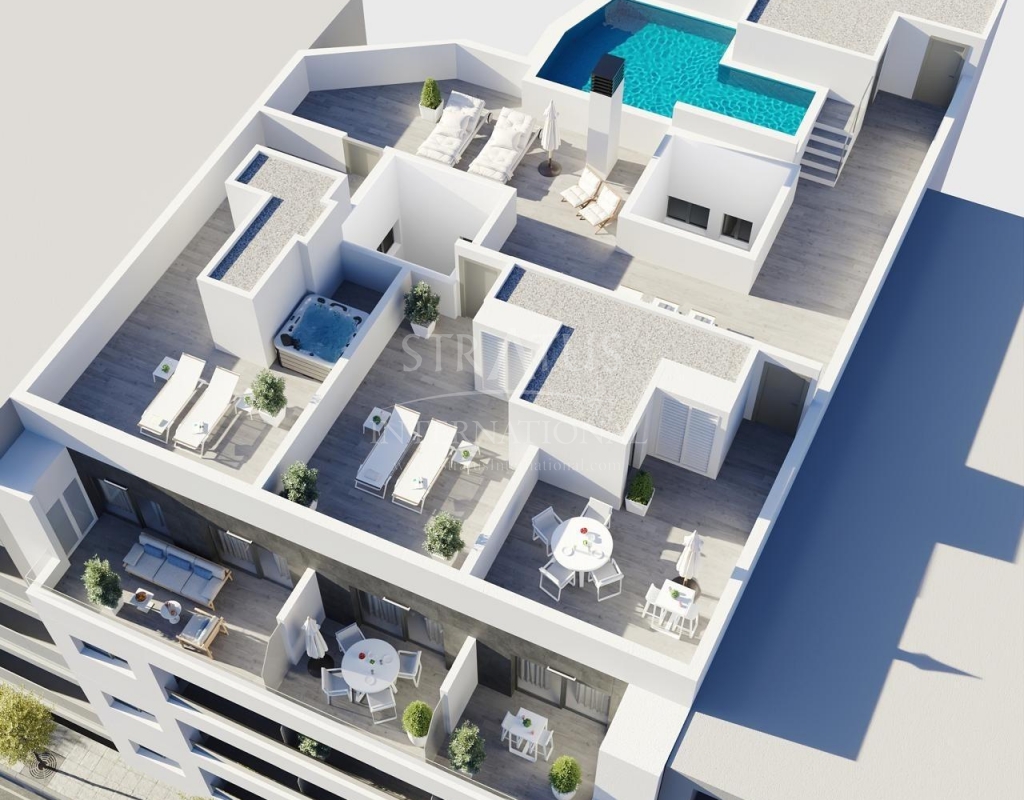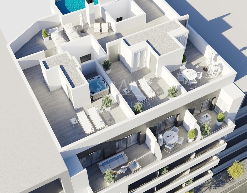 Apartamentos de nueva construcción en Torrevieja A solo 400 m de la Playa del Cura Ubicación privilegiada en el corazón de Torrevieja Descubra estos apartamentos y áticos a estrenar en una de las zonas más cotizadas de Torrevieja, a solo 400 m de la Playa del Cura y a 150 m del paseo marítimo. Situado en el centro de la ciudad, este animado barrio ofrece todos los servicios esenciales a poca distancia, incluyendo supermercados, tiendas, restaurantes, cafeterías y transporte público. Torrevieja es una conocida ciudad costera de la Costa Blanca, famosa por su clima mediterráneo templado, su animado ambiente y su estilo de vida junto al mar durante todo el año. Apartamentos modernos con distribuciones espaciosas Esta exclusiva promoción nueva consta de solo 12 apartamentos y áticos de 2 o 3 dormitorios, diseñados para ofrecer comodidad, funcionalidad y estilo contemporáneo. Los apartamentos de las plantas intermedias cuentan con amplias terrazas, mientras que los áticos disfrutan de un solárium privado adicional, ideal para tomar el sol o comer al aire libre. Todas las viviendas incluyen una cocina abierta conectada con el salón-comedor, lo que crea interiores luminosos y acogedores. Los dormitorios cuentan con armarios empotrados y los baños están totalmente equipados con muebles, espejos y mamparas de ducha. Hay plazas de aparcamiento subterráneo y trasteros opcionales disponibles con un coste adicional. Acabados de calidad y características de eficiencia energética Los apartamentos están construidos con materiales de alta calidad y un fuerte enfoque en la eficiencia energética. La carpintería exterior de aluminio incluye tecnología de rotura de puente térmico y doble acristalamiento para el aislamiento térmico y acústico. Las persianas motorizadas añaden comodidad y seguridad. Cada vivienda cuenta con preinstalación de aire acondicionado y calefacción por conductos, puertas de entrada reforzadas y puertas interiores lacadas en blanco. El agua caliente se produce mediante un sistema aerotérmico, lo que reduce el consumo de energía y mejora la sostenibilidad. Solárium en la azotea con piscina comunitaria Los residentes pueden disfrutar de un solárium exclusivo en la azotea con piscina comunitaria, accesible por ascensor o escaleras. Esta zona privada es perfecta para relajarse, tomar el sol y disfrutar de las vistas panorámicas de la ciudad. Ofrece un refugio tranquilo sobre las animadas calles de Torrevieja y añade un valor significativo a la promoción. Estilo de vida y alrededores de Torrevieja Torrevieja es conocida por su extenso litoral, sus playas de arena y sus emblemáticas salinas. El Parque Natural de las Lagunas de La Mata y Torrevieja se encuentra a unos 5 km y ofrece rutas de senderismo y paisajes únicos. Varios campos de golf, como Villamartin Golf y Las Colinas Golf, se encuentran a entre 12 y 18 km. El puerto deportivo y el puerto de Torrevieja están a aproximadamente 1 km. El aeropuerto de Alicante está a unos 45 km y el aeropuerto internacional de Murcia a unos 65 km, ambos con excelentes conexiones europeas. Su hogar en la costa le espera No pierda esta oportunidad de adquirir un moderno apartamento de nueva construcción cerca de la playa en Torrevieja. Póngase en contacto con nosotros hoy mismo para obtener más información o concertar una visita privada.Especificaciones