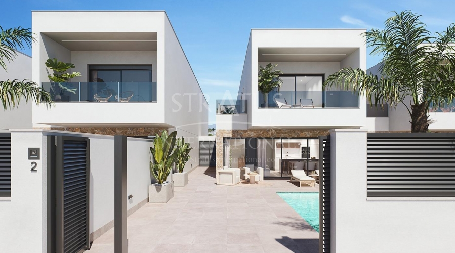 Modernas villas de nueva construcción con piscina privada en San Pedro del Pinatar Diseño contemporáneo y calidad de vida superior Descubra la tercera fase de este exclusivo proyecto residencial en San Pedro del Pinatar, donde la arquitectura moderna se une al confort y la funcionalidad. Estas 14 villas adosadas están diseñadas con un estilo minimalista y acabados de alta calidad, ofreciendo una experiencia de vida elegante y sofisticada en la Costa Cálida. Cada villa cuenta con 3-4 amplios dormitorios, 3 baños, piscina privada, terrazas y jardín privado, creando el entorno perfecto para la privacidad, la relajación y la vida al aire libre mediterránea. San Pedro del Pinatar es una de las localidades más cotizadas de la zona del Mar Menor, conocida por sus salinas naturales, sus tranquilas playas y su agradable clima durante todo el año, lo que la hace ideal tanto para vivir como para pasar las vacaciones. Distribución diáfana diseñada para la vida moderna Las villas están cuidadosamente distribuidas con una cocina abierta conectada a una luminosa sala de estar y comedor. Las grandes ventanas de la sala de estar, con persianas motorizadas, proporcionan acceso directo a la zona de la piscina y permiten que la luz natural inunde los espacios interiores. Las características principales de cada propiedad incluyen: 3 dormitorios con armarios empotrados 3 baños completamente equipados con tocadores, espejos y mamparas de ducha Cocina amueblada con electrodomésticos Balay incluidos Piscina privada y zona de jardín Iluminación LED interior y exterior Terrazas en la primera planta y solárium opcional en la azotea Plaza de aparcamiento en la parcela Sistema aerotérmico para agua caliente Paneles solares fotovoltaicos para una mayor eficiencia energética Preinstalación de aire acondicionado por conductos Estas viviendas están diseñadas para combinar sostenibilidad, comodidad y estilo moderno en cada detalle. Ubicación privilegiada cerca de playas y servicios Situada entre el Mar Menor y el mar Mediterráneo, San Pedro del Pinatar es un paraíso para los amantes de la playa y los deportes acuáticos. La localidad ofrece un animado puerto deportivo, baños de barro naturales, tiendas, restaurantes, instalaciones deportivas y excelentes servicios durante todo el año. Playas del Mar Menor a 3 km Playas del Mediterráneo a 5 km Centro comercial Dos Mares a 5 km Lo Romero Golf a 10 km Roda Golf a 15 km Aeropuerto de Murcia Corvera a 30 km Aeropuerto de Alicante a 80 km Puerto deportivo de San Pedro a 4 km Una vivienda ideal para vivir y como inversión Gracias a su ubicación, diseño y características de eficiencia energética, estas villas representan una excelente oportunidad como residencia permanente, vivienda vacacional o inversión para alquilar en una de las zonas más atractivas de la Costa Cálida. Póngase en contacto con nosotros hoy mismo para obtener más información o concertar una visita y asegurarse su nueva villa en San Pedro del Pinatar.Especificaciones