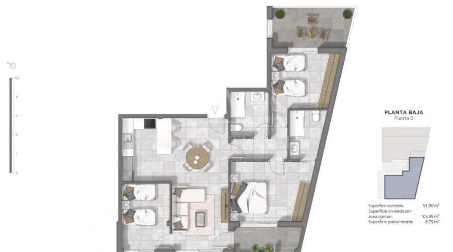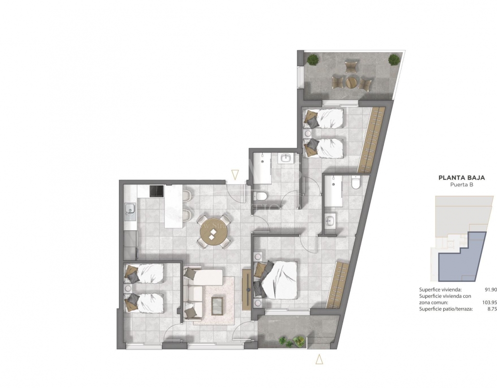 Apartamentos de nueva construcción en el centro de Guardamar del Segura, Costa Blanca Ubicación privilegiada cerca de la playa Descubra este excepcional complejo residencial de nueva construcción situado en el corazón de Guardamar del Segura, una encantadora ciudad costera famosa por sus dunas naturales, bosques de pinos y playas de arena dorada. Con una ubicación ideal a solo 1 km de la playa y a poca distancia de tiendas, restaurantes, supermercados y servicios de ocio, este proyecto ofrece el equilibrio perfecto entre comodidad y estilo de vida mediterráneo. Viviendas elegantes diseñadas para el confort Esta moderna promoción consta de apartamentos de 2 y 3 dormitorios con 2 baños (uno de ellos en suite). Los compradores pueden elegir entre viviendas en planta baja con terraza y patio, apartamentos en plantas intermedias con terraza o áticos con solárium privado, ideales para disfrutar del sol y la brisa marina durante todo el año. Cada propiedad incluye una cocina abierta integrada en un amplio salón, armarios empotrados y un trastero privado en la azotea. Hay plazas de aparcamiento opcionales en la planta baja para mayor comodidad. Calidades premium y eficiencia energética Diseñadas para ofrecer comodidad y eficiencia modernas, las viviendas incluyen acabados de alta calidad: Baños totalmente equipados con mueble de lavabo, espejo y mamparas Puerta de entrada reforzada de seguridad Sistema de agua caliente aerotérmica Ventanas de doble acristalamiento con rotura de puente térmico Ascensor con acceso a todas las plantas Bonitos espacios comunes El complejo cuenta con atractivas zonas verdes, una piscina comunitaria y un solárium comunitario en la azotea, lo que proporciona a los residentes relajantes espacios al aire libre bajo el sol. Disfrute de lo mejor de Guardamar Guardamar del Segura ofrece 11 km de playas naturales, un puerto deportivo con actividades durante todo el año, instalaciones deportivas con pádel, tenis, fútbol y una piscina cubierta climatizada, así como parques, mercados y lugares de interés cultural. Con su ambiente costero relajado y su completa oferta de servicios, es un lugar ideal tanto para vivir como para pasar las vacaciones. Distancias clave: Playa: 1 km Aeropuerto de Alicante-Elche: 20 km La Marquesa Golf: 8 km Puerto deportivo de Torrevieja: 14 km Puerto deportivo de Guardamar: 2 km Asegúrese su nueva vivienda en la Costa Blanca No pierda la oportunidad de vivir en una de las zonas más deseadas de la Costa Blanca. Póngase en contacto con nosotros hoy mismo para concertar una visita y descubrir su futura vivienda en Guardamar del Segura.Especificaciones