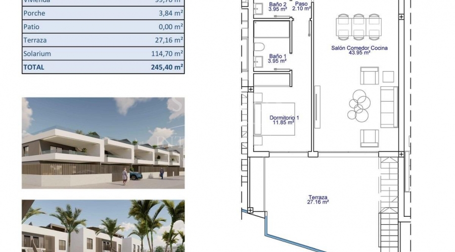 Apartamentos y bungalós de nueva construcción en venta en Pilar de la Horadada, cerca de la playa Exclusiva urbanización residencial en el sur de la Costa Blanca Descubra este moderno complejo residencial de nueva construcción situado en Pilar de la Horadada, la localidad más meridional de la Costa Blanca. Esta urbanización boutique ofrece una selección de apartamentos y bungalós contemporáneos diseñados para combinar comodidad, funcionalidad y estilo de vida mediterráneo. El proyecto consta de solo 26 viviendas cuidadosamente diseñadas con 2 o 3 dormitorios y 2 baños, lo que lo convierte en una opción ideal tanto para residencia permanente como para vacaciones. El complejo está situado en una tranquila zona residencial a poca distancia del centro de la ciudad, donde los residentes pueden disfrutar de restaurantes, cafeterías, supermercados, tiendas locales y todos los servicios esenciales. Pilar de la Horadada es una encantadora ciudad española conocida por su ambiente acogedor, su animada calle principal y sus hermosas plazas. Con excelentes conexiones con las zonas costeras y los complejos de golf cercanos, es un destino muy popular entre los compradores internacionales que buscan sol y calidad de vida. Apartamentos y bungalós con espacios exteriores privados La promoción ofrece dos tipos de propiedades diferentes para adaptarse a diversos estilos de vida. El complejo incluye 16 apartamentos modernos. Los compradores pueden elegir entre unidades en la planta baja con jardines privados, apartamentos en la planta intermedia con amplias terrazas o áticos con terrazas privadas y soláriums en la azotea. También hay 10 bungalós disponibles. Los bungalós de la planta baja cuentan con jardines privados y aparcamiento dentro de la parcela, mientras que los bungalós de la planta superior ofrecen terrazas y soláriums privados. Hay aparcamientos y trasteros opcionales en el sótano por un coste adicional. Todas las viviendas han sido diseñadas con interiores luminosos, distribuciones abiertas y cómodas zonas de estar que se extienden de forma natural a los espacios exteriores. Construcción de calidad y características modernas Las viviendas están construidas con materiales de alta calidad y sistemas modernos para garantizar el confort y la eficiencia energética durante todo el año. Cocinas amuebladas Baños totalmente equipados con mamparas de ducha y calefacción por suelo radiante Sistema de agua caliente aerotérmico de bajo consumo Preinstalación para aire acondicionado por conductos Los residentes también se benefician de una piscina comunitaria rodeada de jardines y zonas para tomar el sol, lo que crea un ambiente relajante para disfrutar del clima mediterráneo. Excelente ubicación cerca de playas y campos de golf La urbanización goza de una ubicación estratégica cerca de algunas de las mejores playas y campos de golf de la región. Playa de Torre de la Horadada a 3 km Playa de Mil Palmeras a 3 km Campo de golf Lo Romero a 6 km Aeropuerto Internacional de la Región de Murcia a 45 km Aeropuerto de Alicante-Elche a 75 km La zona también ofrece excelentes conexiones por carretera con las localidades costeras cercanas, los puertos deportivos y las instalaciones de ocio a lo largo de la Costa Blanca y la Costa Cálida. Encuentre su nuevo hogar en Pilar de la Horadada Este atractivo complejo residencial de nueva construcción ofrece viviendas modernas, acabados de calidad y una fantástica ubicación cerca de la playa. Póngase en contacto con nosotros hoy mismo para obtener más información o concertar una visita y asegurarse su nueva propiedad en la Costa Blanca.Especificaciones