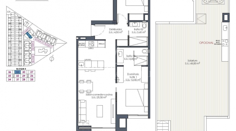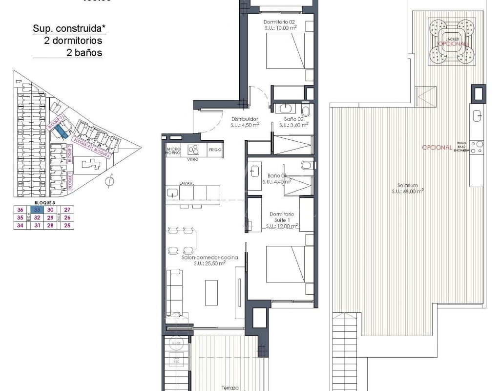Apartamentos de nueva construcción en La Serena Golf-Los Alcázares, cerca de la playa Vida moderna frente al campo de golf en la Costa Cálida Descubra este exclusivo complejo residencial de nueva construcción situado en La Serena Golf, en Los Alcázares. Esta urbanización contemporánea cuenta con 66 elegantes apartamentos de 2 o 3 dormitorios y 2 baños, uno de ellos en suite, diseñados para ofrecer comodidad, elegancia y un excepcional estilo de vida mediterráneo a solo 300 metros del Mar Menor. Los Alcázares es una encantadora localidad costera conocida por su ambiente relajado, sus playas de arena y su largo paseo marítimo. Con más de 300 días de sol al año, la zona ofrece un entorno perfecto para la vida al aire libre, los deportes acuáticos y el golf. La localidad también cuenta con una amplia selección de restaurantes, tiendas, puertos deportivos e instalaciones deportivas, lo que la convierte en un destino muy deseable tanto para la residencia permanente como para las vacaciones. Apartamentos con terrazas, jardines y soláriums privados El complejo residencial ofrece varios tipos de propiedades que se adaptan a diferentes estilos de vida. Los compradores pueden elegir entre apartamentos en planta baja con jardines privados, viviendas en plantas intermedias con amplias terrazas o áticos con terrazas y grandes soláriums en la azotea. Los soláriums incluyen una ducha exterior y ofrecen la opción de añadir una cocina de verano y un jacuzzi privado, creando un espacio ideal para relajarse y divertirse mientras se disfruta de las vistas abiertas al campo de golf y al paisaje circundante. Cada vivienda ha sido diseñada con interiores luminosos y espacios diáfanos que conectan a la perfección con las zonas exteriores. Servicios estilo resort y zonas comunes excepcionales Una de las características más distintivas de esta promoción es su concepto de estilo resort. Los residentes pueden disfrutar de una espectacular piscina estilo laguna de aproximadamente 190 m2 con acceso estilo playa y zonas de relax con camas balinesas. Las instalaciones comunes adicionales incluyen jardines paisajísticos, una zona de spa, gimnasio y sauna situados en el sótano. El complejo también ofrece un parque infantil, dos pistas de petanca y aseos comunes cerca de la zona de la piscina, creando un ambiente acogedor para los residentes y los invitados. Acabados de calidad y características modernas Los apartamentos están construidos con materiales modernos y especificaciones de alta calidad diseñadas para ofrecer comodidad y estilo. Cocina totalmente equipada con electrodomésticos de acabado en cristal blanco Baños con tocadores, mamparas de ducha y espejos retroiluminados Persianas motorizadas Paquete de iluminación básico Aire acondicionado por conductos totalmente instalado Plaza de aparcamiento subterráneo para cada propiedad Aparcamiento subterráneo para bicicletas y trasteros opcionales Ubicación privilegiada cerca de la playa y el golf Playa del Mar Menor a 0,3 km Golf La Serena junto a la urbanización Centro de Los Alcázares a 2 km Cartagena a 22 km Murcia a 40 km Aeropuerto Internacional de la Región de Murcia a 30 km Aeropuerto de Alicante-Elche a 90 km Las tranquilas y poco profundas aguas del Mar Menor son ideales para nadar, navegar y practicar paddle surf durante todo el año. Asegure su vivienda en La Serena Golf Resort Estos modernos apartamentos combinan la vida junto a la playa, vistas al campo de golf desde la mayoría de las unidades y comodidades estilo resort en una de las zonas más atractivas de la Costa Cálida. Póngase en contacto con nosotros hoy mismo para recibir más información o concertar una visita y asegurar su nueva vivienda en La Serena Golf-Los Alcázares.Especificaciones