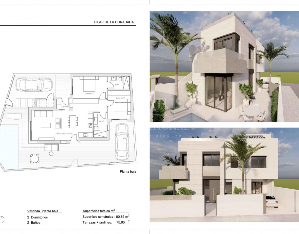 Bungalows neufs exclusifs avec piscine privée à Pilar de la Horadada Une vie moderne dans un emplacement privilégié sur la Costa Blanca Découvrez un nouveau programme immobilier exclusif composé de seulement deux bungalows haut de gamme situés au cœur de Pilar de la Horadada, une charmante ville côtière de la Costa Blanca réputée pour ses plages de sable fin, son ambiance paisible et son style de vie méditerranéen. Le complexe résidentiel est situé à seulement 2,5 km de la plage et à quelques pas des supermarchés, des magasins, des restaurants et des services quotidiens essentiels. Avec d'excellentes liaisons routières et l'aéroport d'Alicante à seulement 45 km, cet emplacement offre l'équilibre parfait entre tranquillité, confort et accessibilité. Deux maisons uniques conçues pour le confort Le projet comprend deux élégantes maisons de 2 chambres et 2 salles de bains, conçues avec des finitions de haute qualité et des agencements modernes. L'une des salles de bains est attenante, offrant ainsi plus d'intimité et de commodité. Chaque propriété offre une expérience de vie en plein air unique, adaptée à différents styles de vie. Bungalow au rez-de-chaussée avec grand jardin et piscine privée Le rez-de-chaussée comprend un grand jardin de 75 m² idéal pour les repas en plein air, les bains de soleil et les loisirs. Une piscine privée est incluse, ainsi qu'un parking privé à l'intérieur du terrain. De grandes fenêtres et des espaces ouverts créent une atmosphère lumineuse et accueillante dans toute la maison. Bungalow penthouse avec solarium et piscine privés La résidence à l'étage supérieur dispose d'une place de parking clôturée au rez-de-chaussée et d'un accès par un escalier extérieur. Elle dispose d'une terrasse spacieuse et d'un solarium privé sur le toit avec sa propre piscine, créant ainsi un refuge exclusif pour profiter du climat méditerranéen et d'une vue imprenable. Mode de vie à Pilar de la Horadada Cette commune côtière est connue pour son atmosphère calme et détendue, ses belles plages telles que Mil Palmeras et son large éventail d'activités de plein air. La plongée avec tuba, la plongée sous-marine, les promenades côtières et le vélo font partie du mode de vie quotidien des résidents et des visiteurs. Les amoureux de la nature apprécieront la proximité des marais salants de San Pedro, situés à environ 12 km, qui offrent des paysages pittoresques et une faune sauvage. Distances vers les principaux points d'intérêt Plage : 2,5 km Salines de San Pedro : 12 km Golf Lo Romero : 6 km Aéroport d'Alicante : 45 km Aéroport de Murcie : 40 km Torrevieja : 20 km Assurez-vous dès aujourd'hui votre maison exclusive Saisissez l'opportunité d'acquérir une propriété unique avec des espaces extérieurs exceptionnels dans l'une des zones les plus prisées de la Costa Blanca. Contactez-nous dès aujourd'hui pour organiser une visite et réserver votre nouvelle maison à Pilar de la Horadada.Features