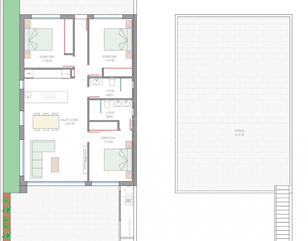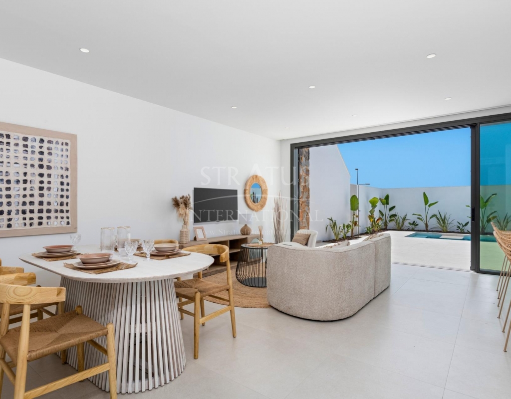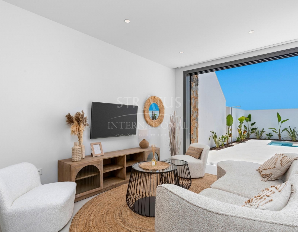 Villas neuves près du Serena Golf à Los Alcazares Villas modernes dans un emplacement privilégié en bord de mer et près d'un golf Ce projet résidentiel exclusif propose des villas modernes situées à Los Alcazares, à proximité du prestigieux Serena Golf et à seulement 1,2 km des plages de sable de la Mar Menor. Situées dans l'une des zones les plus attrayantes de la région de Murcie, ces maisons allient un design contemporain, le confort et un excellent emplacement à proximité de la mer, du golf et de tous les services quotidiens. Los Alcazares est une ville côtière bien établie, connue pour son style de vie détendu, sa longue promenade, ses sports nautiques et son climat doux tout au long de l'année. Conception de plain-pied avec espaces extérieurs privés Le complexe comprend des villas élégantes de 3 chambres et 2 salles de bains, disponibles en deux tailles différentes d'environ 106 m² et 130 m². Le modèle plus grand comprend également des toilettes supplémentaires pour les invités. Toutes les villas sont conçues sur un seul étage, offrant un cadre de vie pratique et confortable. La cuisine ouverte, la salle à manger et le salon communiquent directement avec une terrasse et un jardin privé avec piscine, créant un espace idéal pour la vie à l'intérieur et à l'extérieur. Chaque propriété comprend également un solarium privé et un parking sur le terrain. Finitions de haute qualité et équipements modernes Ces villas sont construites avec des matériaux de haute qualité et équipées de fonctionnalités modernes. Les cuisines entièrement équipées sont disponibles en finition blanche brillante ou bois et comprennent des plans de travail en quartz, un évier en acier inoxydable, une plaque à induction avec hotte intégrée, un four, un micro-ondes, un lave-linge, un réfrigérateur intégré et un lave-vaisselle. Les salles de bains sont équipées de meubles, de miroirs, d'éclairage et de sèche-serviettes électriques. Les équipements supplémentaires comprennent des stores électriques dans les chambres, un éclairage LED dans toute la propriété et un système de climatisation complet par conduits de Fujitsu. Piscine privée et confort économe en énergie Chaque villa comprend une piscine privée avec un revêtement en carreaux de céramique bleus, des marches intégrées et un éclairage LED blanc. La piscine est pré-équipée pour l'installation d'une pompe à chaleur. La combinaison d'une climatisation efficace, d'une construction moderne et d'une conception bien pensée garantit un confort tout au long de l'année. Excellente connectivité et distances clés Les villas se trouvent à quelques pas du centre-ville de Los Alcazares et à proximité du Serena Golf. La plage est à environ 1,2 km. La ville de Carthagène, située à environ 20 km, offre une scène culturelle et gastronomique riche. L'aéroport international de Murcie-Corvera est à environ 22 km et l'aéroport d'Alicante à environ 90 km. Plusieurs terrains de golf et marinas se trouvent également à proximité, ce qui rend cet emplacement idéal pour y vivre à l'année ou y passer ses vacances. Votre maison idéale au bord de la mer et du golf Si vous recherchez une villa moderne neuve près de la plage et du golf à Los Alcazares, contactez-nous dès aujourd'hui pour obtenir plus d'informations ou organiser une visite privée.Features