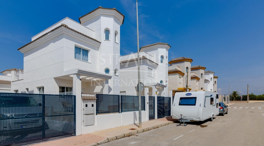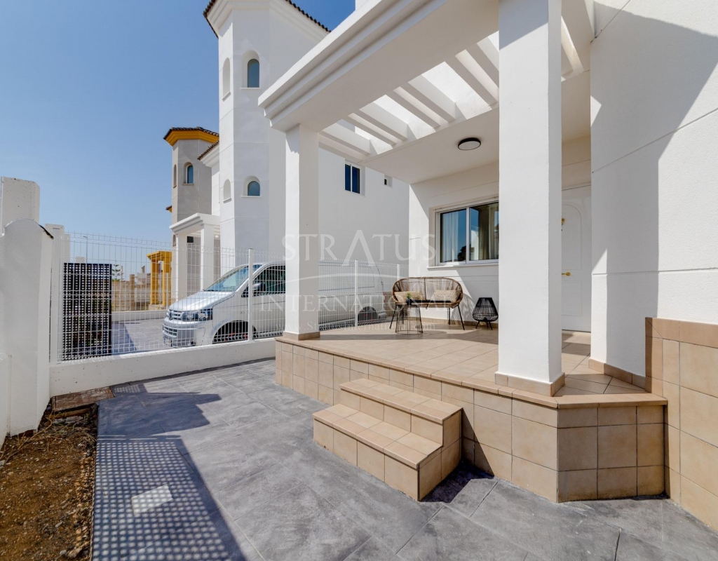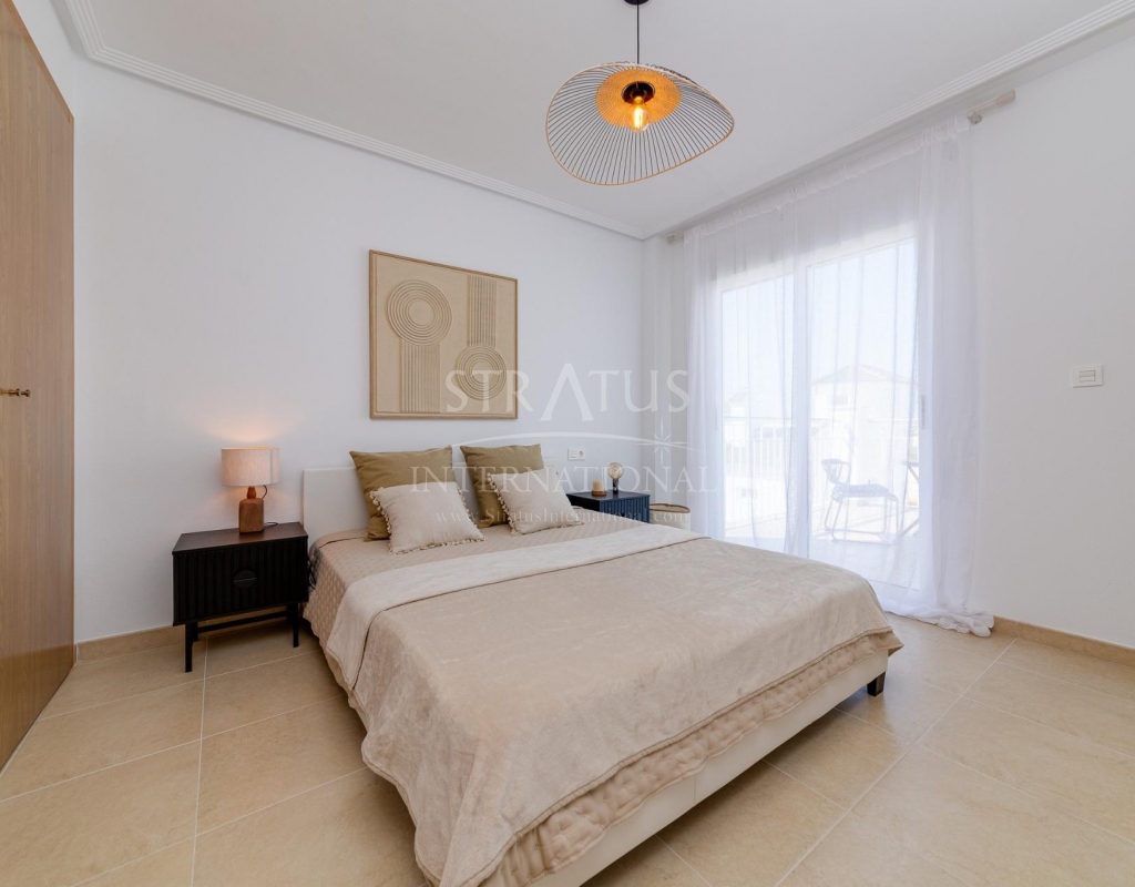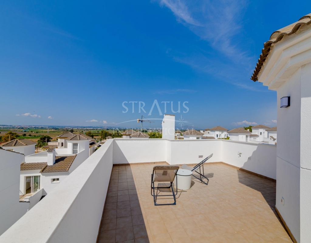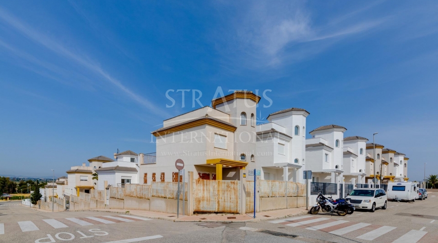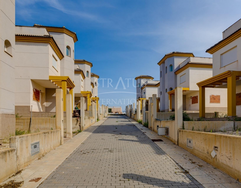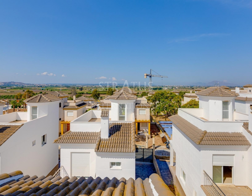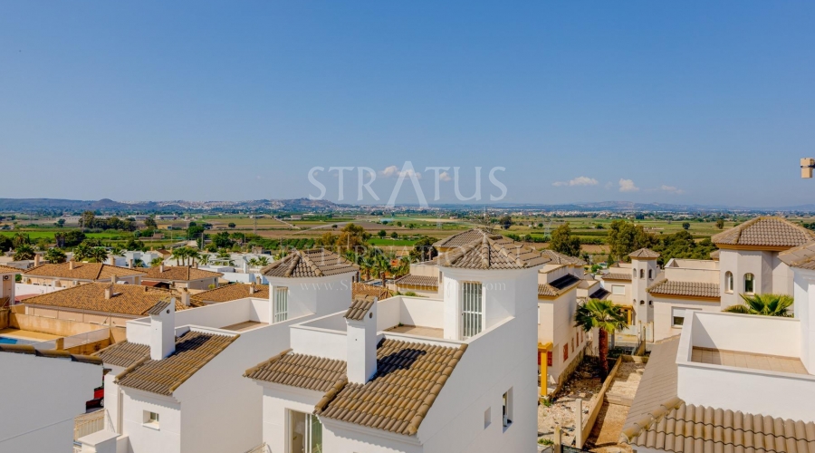 NEW BUILD RESIDENTIAL IN SAN FULGENCIO Residential complex of independent and semi-detached villas in San Fulgencio. The houses consist of 2-3 bedrooms, 3 bathrooms, living room and separate kitchen, 2 terraces on the ground floor, one terrace on the 2nd floor and a solarium on the roof. Each property has private garden and parking space. There is a large communal swimming pool. San Fulgencio is a comfortable and convenient area, known for its excellent infrastructure. In the immediate vicinity of cafes, restaurants, bars, pharmacies, 3 large supermarkets: Lidl, Aldi, Mercadona. Residential complex is located 10 minutes by car from the beach and also 10 minutes from the most famous in this area leisure and family center ¨La Marina Resort¨ with a water park, camping, gym, spa, restaurants, shops and cafes. Residential complex has a unique location – 30 minutes by car from the airport, 40 minutes from the city of Alicante and 20 minutes from the city of Torrevieja.Features