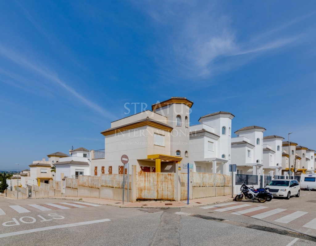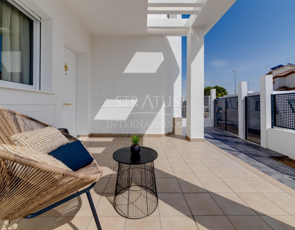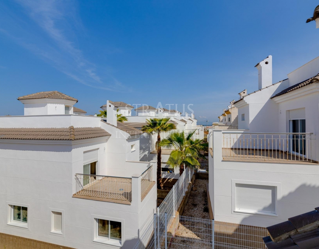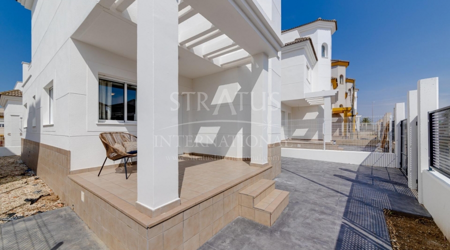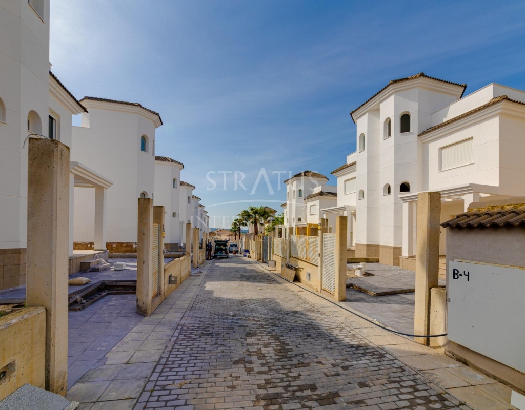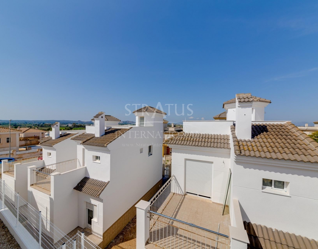NEW BUILD RESIDENTIAL IN SAN FULGENCIO Residential complex of independent and semi-detached villas in San Fulgencio. The houses consist of 3 bedrooms, 3 bathrooms, living room and separate kitchen, 2 terraces on the ground floor, one terrace on the 2nd floor and a solarium on the roof. Each property has private garden and parking space. There is a large communal swimming pool. San Fulgencio is a comfortable and convenient area, known for its excellent infrastructure. In the immediate vicinity of cafes, restaurants, bars, pharmacies, 3 large supermarkets: Lidl, Aldi, Mercadona. Residential complex is located 10 minutes by car from the beach and also 10 minutes from the most famous in this area leisure and family center ¨La Marina Resort¨ with a water park, camping, gym, spa, restaurants, shops and cafes. Residential complex has a unique location – 30 minutes by car from the airport, 40 minutes from the city of Alicante and 20 minutes from the city of Torrevieja.Features