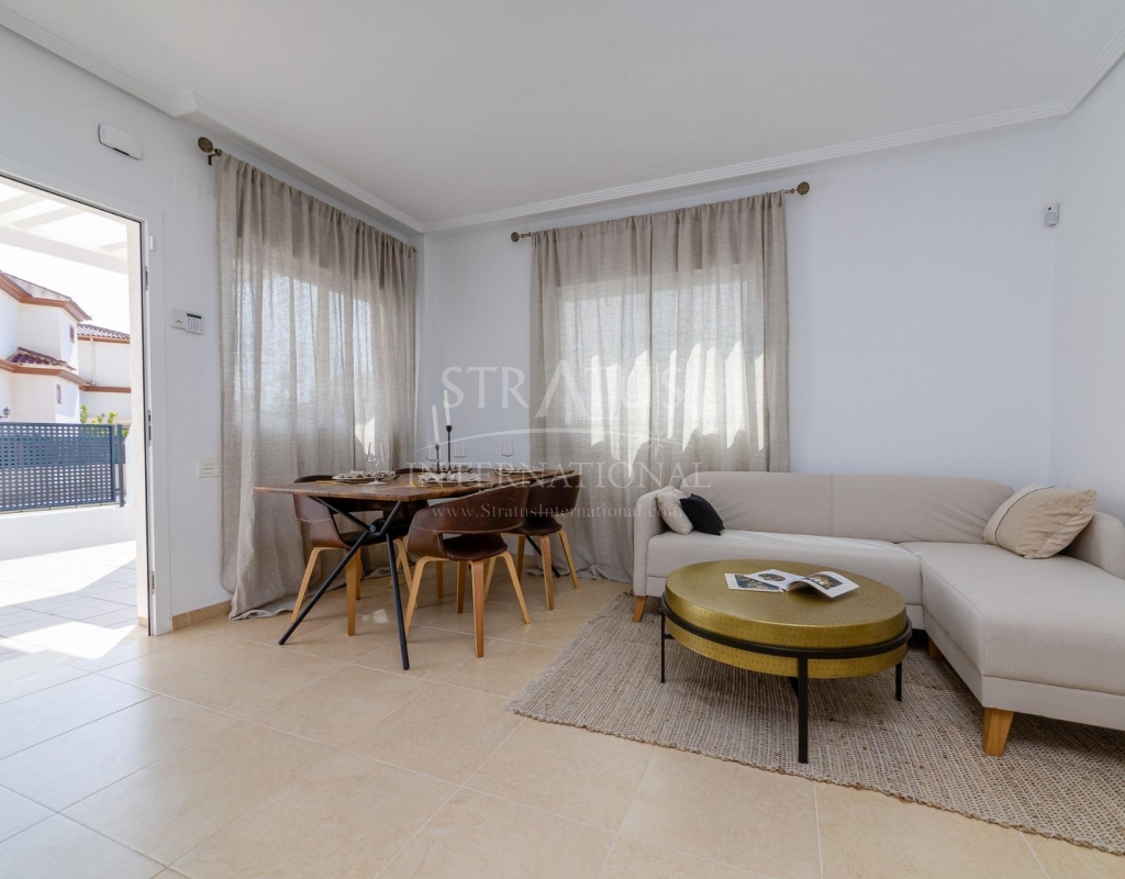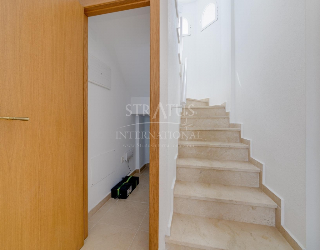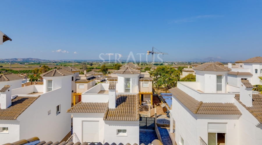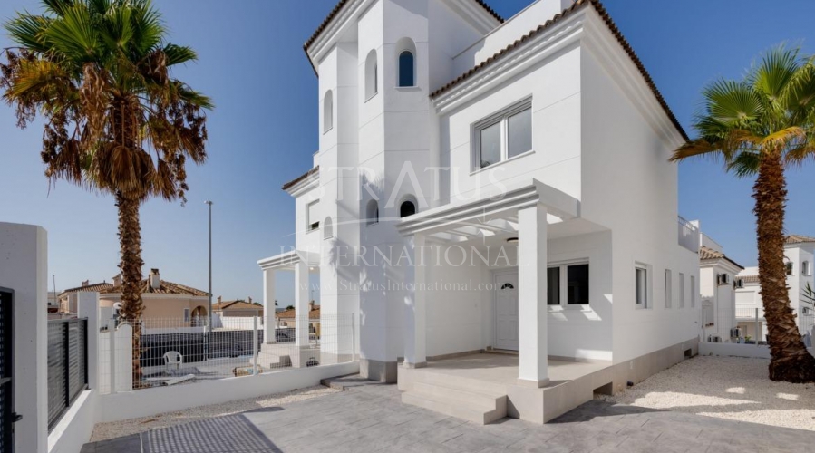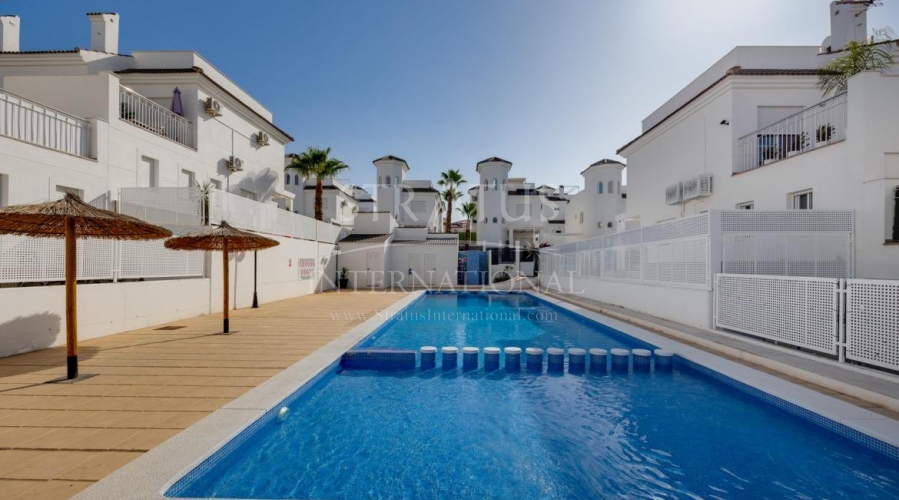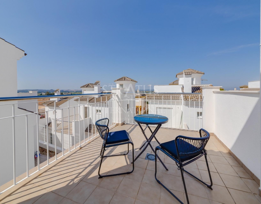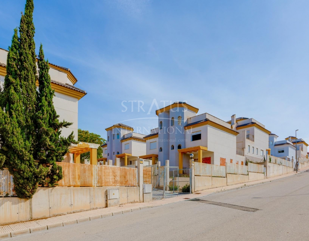 NEW BUILD RESIDENTIAL IN SAN FULGENCIO Residential complex of independent and semi-detached villas in San Fulgencio. The houses consist of 3 bedrooms, 3 bathrooms, living room and separate kitchen, 2 terraces on the ground floor, one terrace on the 2nd floor and a solarium on the roof. Each property has private garden and parking space. There is a large communal swimming pool. San Fulgencio is a comfortable and convenient area, known for its excellent infrastructure. In the immediate vicinity of cafes, restaurants, bars, pharmacies, 3 large supermarkets: Lidl, Aldi, Mercadona. Residential complex is located 10 minutes by car from the beach and also 10 minutes from the most famous in this area leisure and family center ¨La Marina Resort¨ with a water park, camping, gym, spa, restaurants, shops and cafes. Residential complex has a unique location – 30 minutes by car from the airport, 40 minutes from the city of Alicante and 20 minutes from the city of Torrevieja.Features