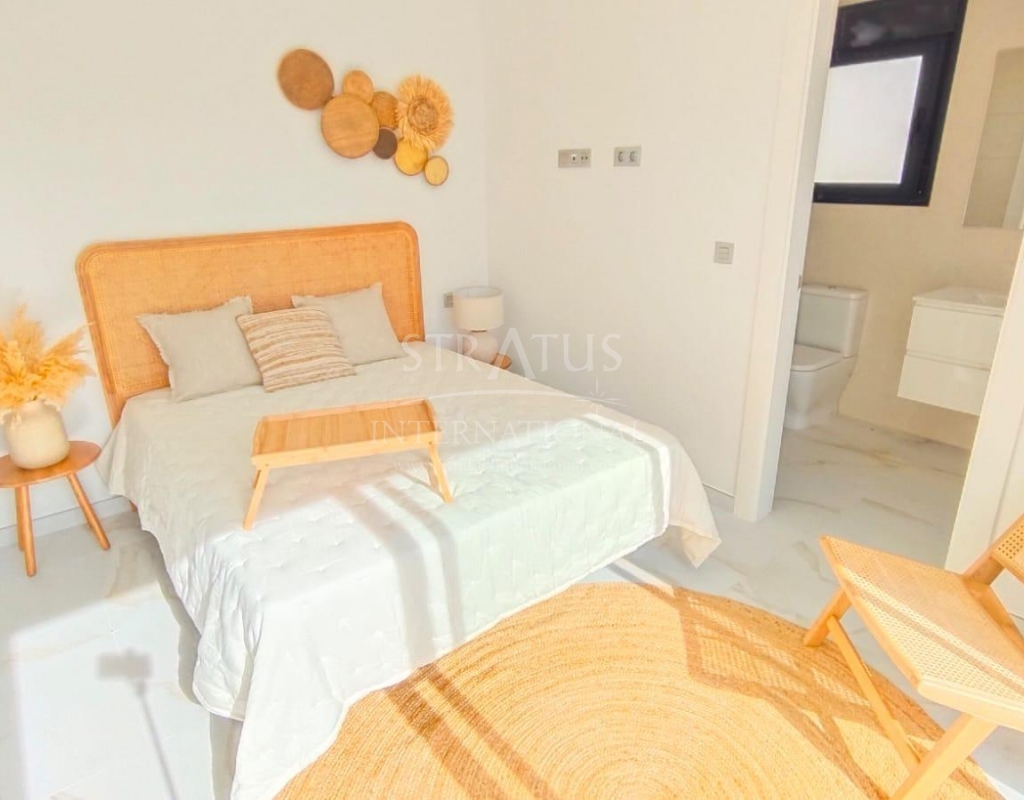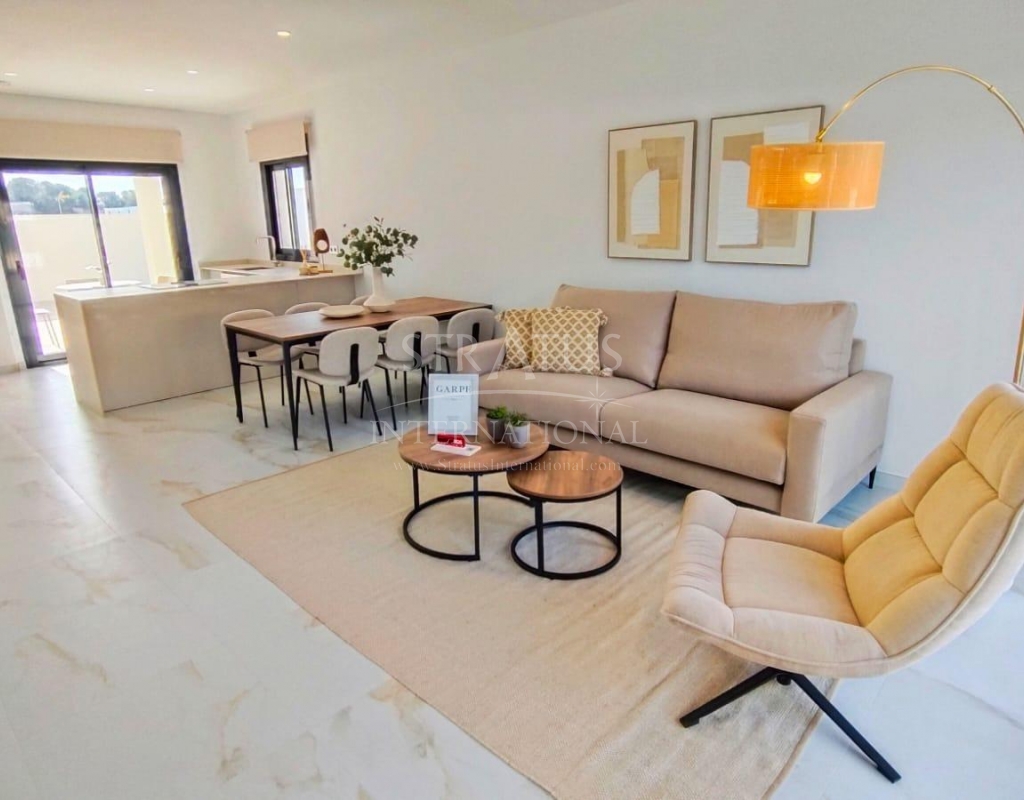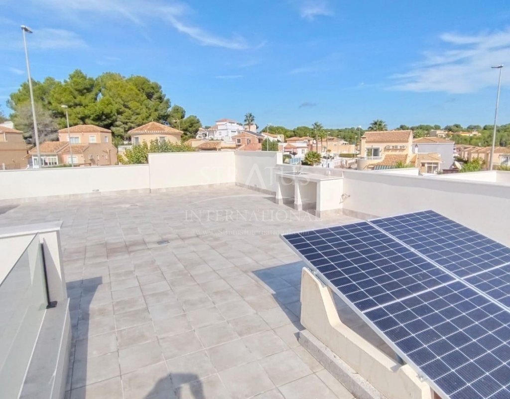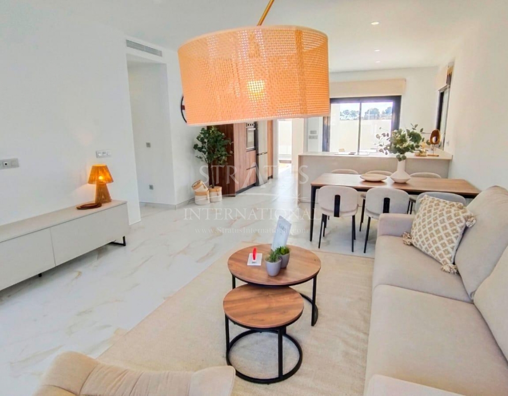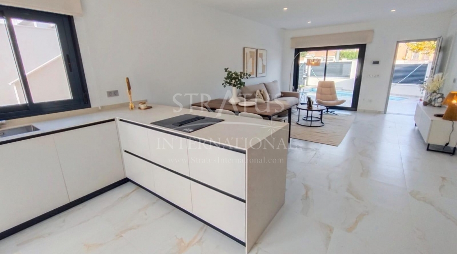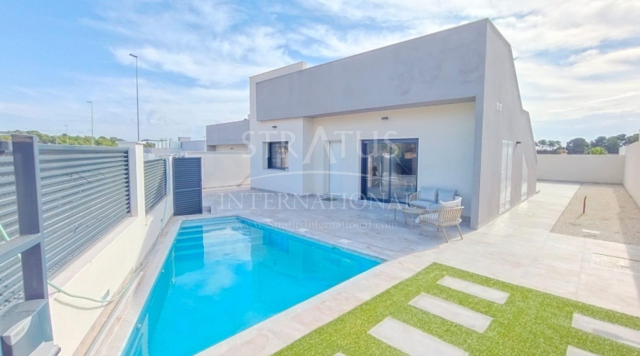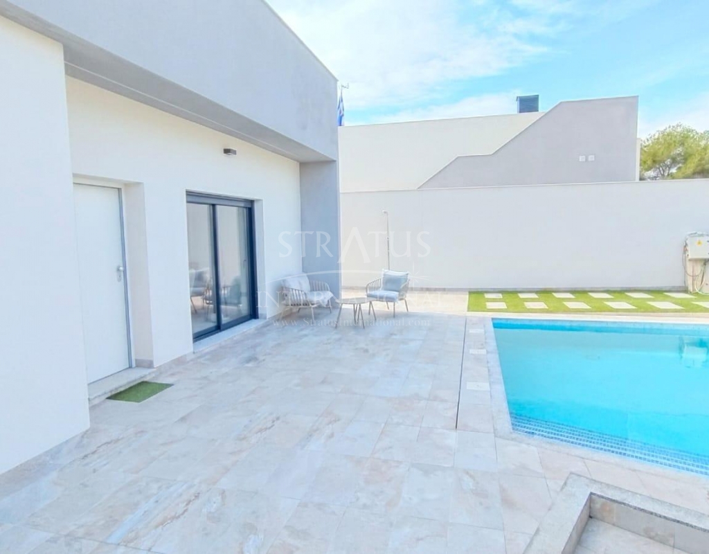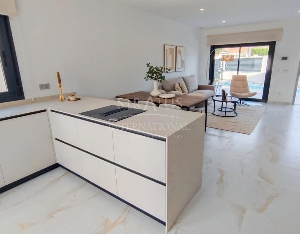 NEW BUILD VILLAS IN PINAR DE CAMPOVERDE Modern residential of newly built villas in Pinar de Campoverde. Small development of only 5 villas, built on one floor with a distribution of 3 bedrooms and 2 bathrooms, open plan living and dining area, fully equipped kitchen, with central island views to the private swimming pool, on independent plots starting at 300,00 m2. There is also a large solarium to enjoy the sun and the beautiful views all year round. The villas are in a privileged location next to the Rio Seco nature reserve and close to amenities, sports facilities and the nearby golf course of Lo Romero, the Spanish town of Pilar de la Horadada and only a 15 minute drive to the white sandy beaches of La Torre De la Horadada. The perfect place if you want to be in a quiet location, surrounded by nature and close to all amenities, golf and beautiful beaches.Features