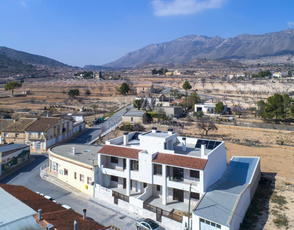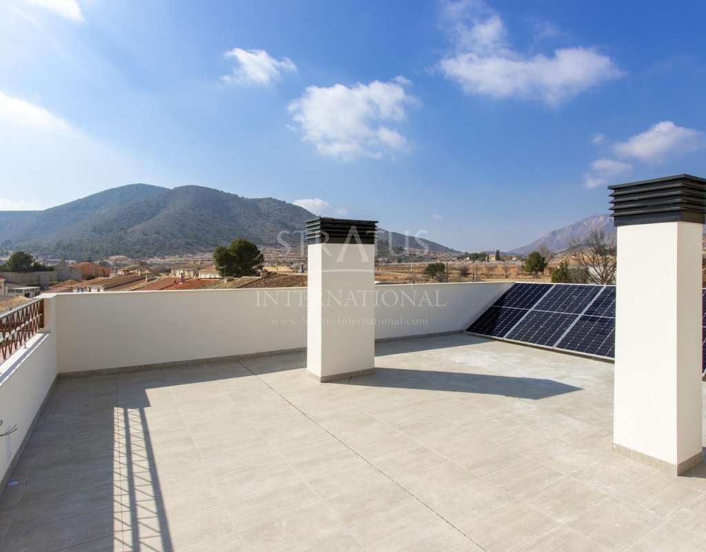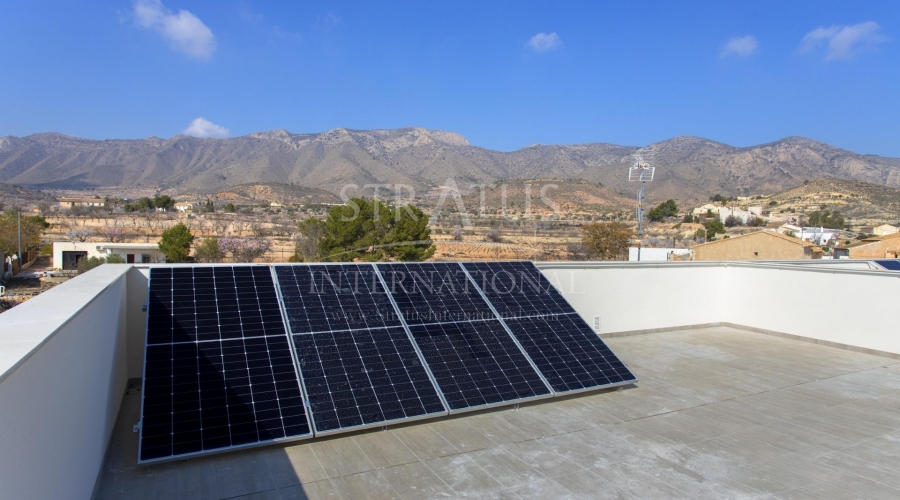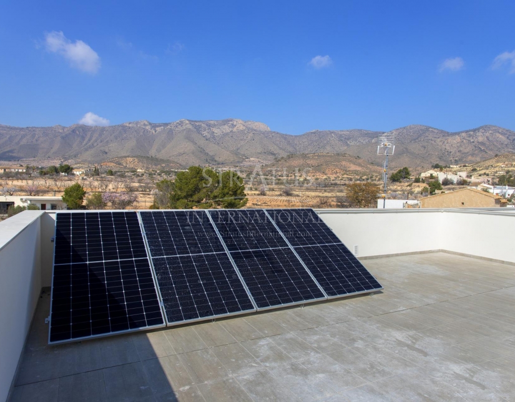 NEW BUILD BUNGALOWS IN HONDON DE LAS NIEVES New Build 4 bungalows located in Hondón de las Nieves (Alicante) All bungalows have 3 bedrooms with fitted wardrobes, 2 bathrooms, large living room, fitted kitchen and terrace. The properties are available on the ground floor with front and rear terrace/garden and on the top floor with terrace and private solarium. The first floor properties have photovoltaic panels on the roof for energy saving. The kitchens are fully furnished and finished with granite or synthetic agglomerate worktops (silestone or simular). The bathrooms are finished with high quality sanitary ware and taps with built-in cistern. These homes have pre-installation for ducted air conditioning with heat pump, forced ventilation with heat recovery, aerothermal system for domestic hot water, the most modern thermal and acoustic insulation, aluminium exterior carpentry with thermal bridge break and shutters. Hondón de las Nieves is a town in the Valencian Community, Spain. It is located in the southwest of the province of Alicante, in the region of Vinalopó Medio. The beaches and Alicante Airport are closely just 30 minutes drive away.Features