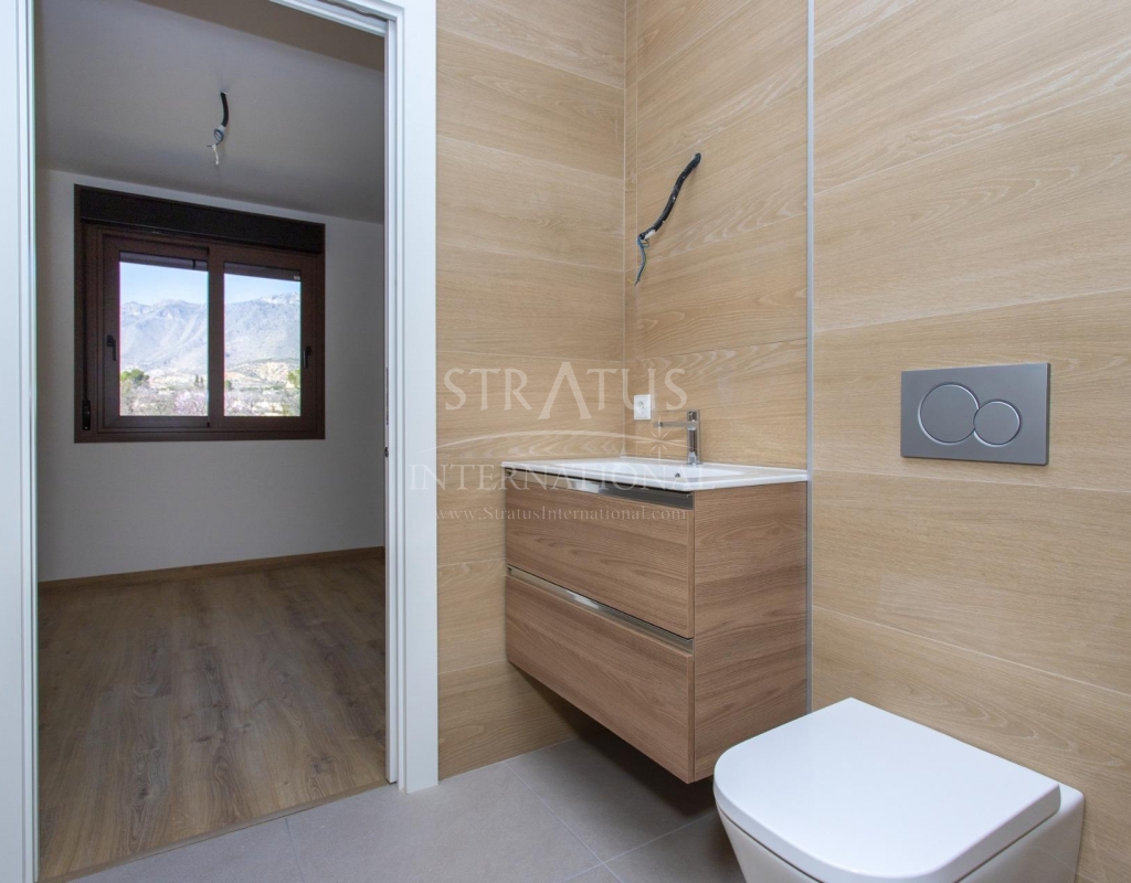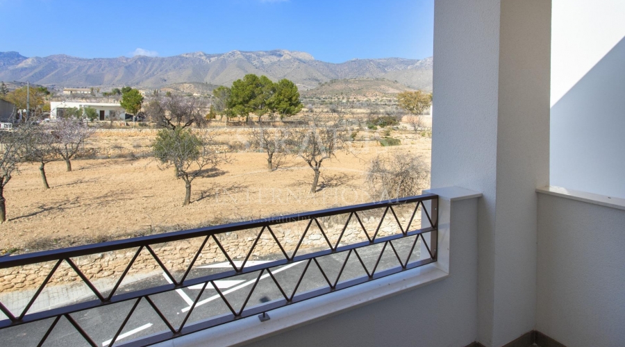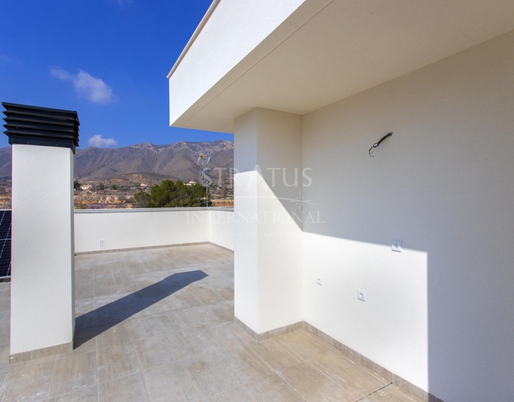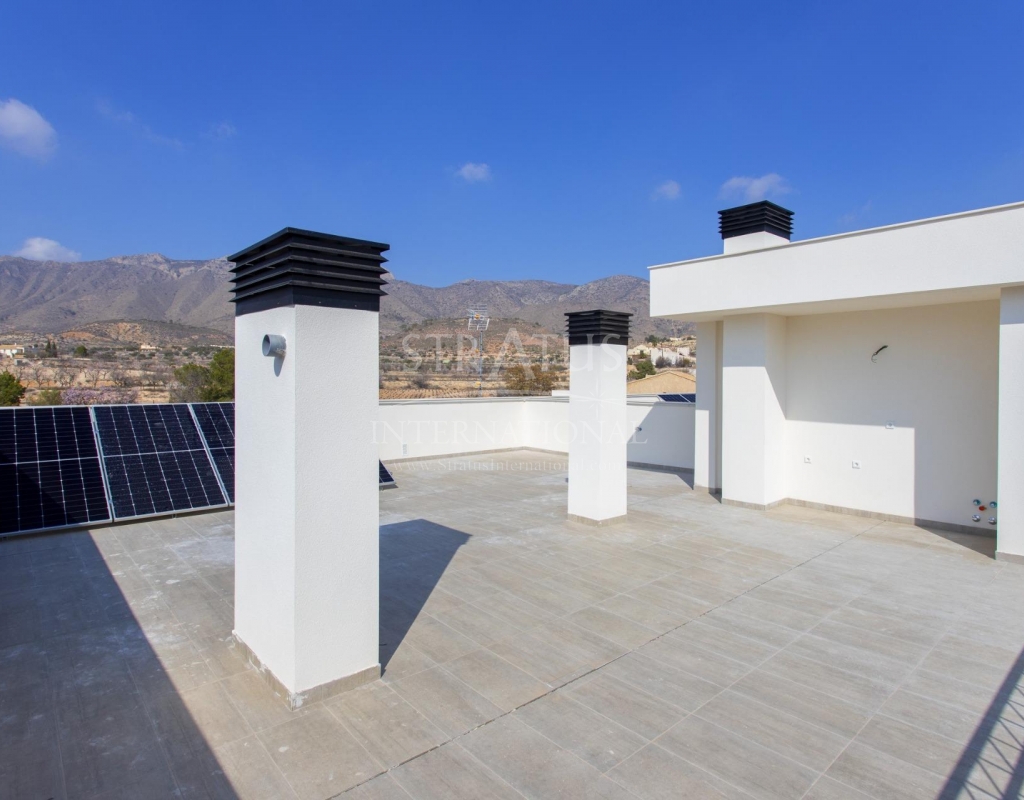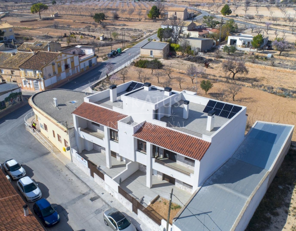 NEW BUILD BUNGALOWS IN HONDON DE LAS NIEVES New Build 4 bungalows located in Hondón de las Nieves (Alicante) All bungalows have 3 bedrooms with fitted wardrobes, 2 bathrooms, large living room, fitted kitchen and terrace. The properties are available on the ground floor with front and rear terrace/garden and on the top floor with terrace and private solarium. The first floor properties have photovoltaic panels on the roof for energy saving. The kitchens are fully furnished and finished with granite or synthetic agglomerate worktops (silestone or simular). The bathrooms are finished with high quality sanitary ware and taps with built-in cistern. These homes have pre-installation for ducted air conditioning with heat pump, forced ventilation with heat recovery, aerothermal system for domestic hot water, the most modern thermal and acoustic insulation, aluminium exterior carpentry with thermal bridge break and shutters. Hondón de las Nieves is a town in the Valencian Community, Spain. It is located in the southwest of the province of Alicante, in the region of Vinalopó Medio. The beaches and Alicante Airport are closely just 30 minutes drive away.Features