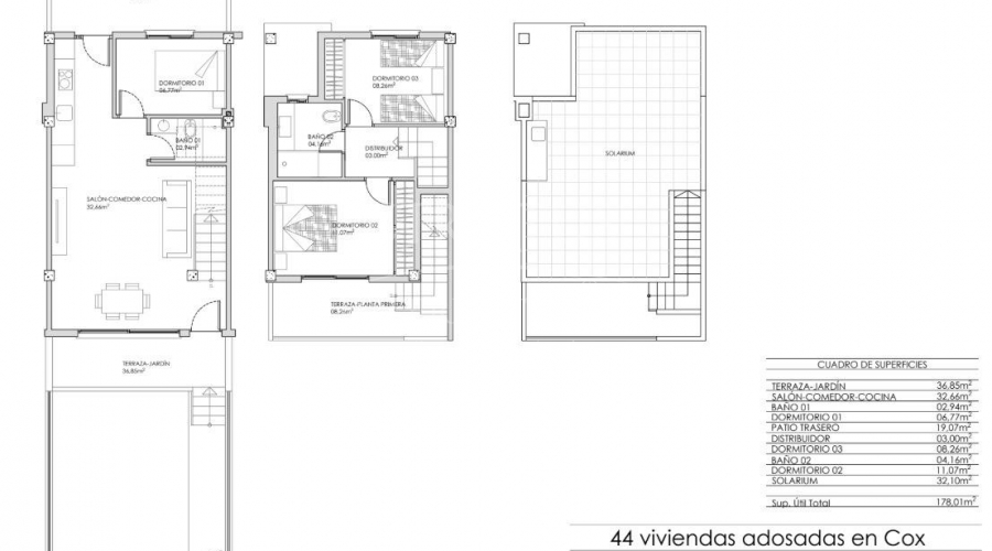 New Build Townhouses for Sale in Cox – 44 Modern Homes with Great Amenities Discover a new residential development of 44 modern townhouses in Cox, Alicante. These homes are available in 2- and 3-bedroom layouts, each featuring a private solarium, terraces, patios, and private parking. The community offers access to shared areas, including a communal swimming pool, creating an ideal environment for relaxation. Prime Location with Excellent Connectivity This development is located just 40 km from Alicante International Airport, making travel easy and convenient. Cox is well-connected to major cities: Orihuela is only 8 km away, Elche 20 km, Alicante 48 km, and Murcia 25 km. Golf enthusiasts will appreciate the nearby courses such as La Finca (12 km) and Vistabella (14 km). Easy Access to Major Roads Cox provides easy access to the AP-7 motorway and the Autovía del Mediterráneo (A-7), as well as local routes to surrounding areas such as Granja de Rocamora and Callosa de Segura. The town and surrounding areas boasts a population of over 35,000, offering a peaceful yet vibrant lifestyle. Local Amenities and Attractions Residents will enjoy a wide range of local amenities, including shops, schools, sports facilities, medical centers, and quick access to the beaches of the Costa Blanca, such as Guardamar del Segura and Torrevieja. Included Features Each home comes with a landscaped garden, LED lighting, electric shutters, solar panel pre-installation, fitted wardrobes, a security door, a fully equipped kitchen with Silestone countertops, and much more.Features