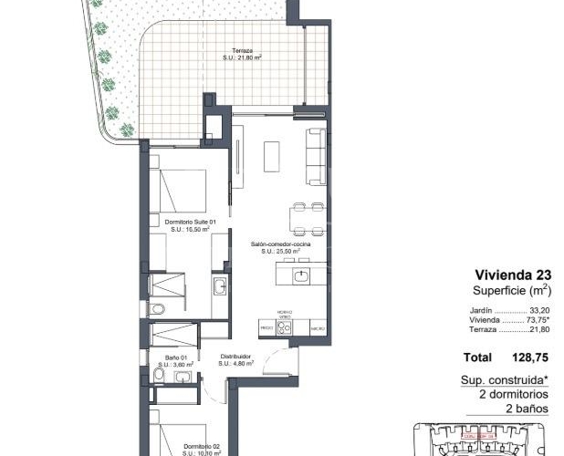 Exclusive New Build Properties in Lo Marabú, Ciudad Quesada Modern Design and Maximum Comfort in a Mediterranean Setting Discover this spectacular residential complex in Lo Marabú, Ciudad Quesada, comprising 80 2 and 3 bedroom homes with 2 bathrooms. Designed with a modern and efficient approach, these properties offer spacious terraces, cross ventilation and high quality finishes to maximise comfort and energy efficiency. The ground floor properties have private gardens, while the top floor properties have private solariums with pre-installation for a Jacuzzi and outdoor shower. In addition, the development has communal swimming pools surrounded by gardens, creating a perfect environment for relaxation and conviviality. High Quality Features for an Exclusive Lifestyle Each home has been designed to offer maximum comfort, with top quality materials and a contemporary design: Large sliding aluminium windows with thermal break. Motorised blinds for greater comfort. Climalit 4+4/14/4/4+4 glazing for thermal and acoustic insulation. Armoured front door with security lock. Fully fitted kitchens with electrical appliances included. Bathrooms with furniture, mirrors and shower screens. 150L aerothermal system for hot water. Complete installation of ducted air conditioning (hot/cold). Lighting in all rooms already incorporated. Parking space included. Thanks to its double façade design, the homes offer natural cross ventilation, providing coolness in summer and reducing energy consumption in air conditioning. Privileged location in Ciudad Quesada Lo Marabú is an exclusive residential area within Ciudad Quesada (Rojales), surrounded by natural spaces and with all services within easy reach. The urbanization is very close to the salt lakes of La Mata and Torrevieja, an ideal environment to enjoy nature and improve your wellbeing. From your new home, you will have quick access to the main points of interest in the area: Guardamar del Segura and Torrevieja beaches - 10 km (15 minutes by car). Alicante-Elche Airport (ALC) - 38 km (35 minutes by car). Murcia-Corvera Airport (RMU) - 65 km (50 minutes drive). Prestigious golf courses - Less than 5 km. Shopping centres and restaurants - Just a few minutes away. Quick access to the AP-7 and N-332 highways, connecting to the whole of the Costa Blanca. A Perfect Home for Enjoying the Mediterranean With their combination of modern design, strategic location and exceptional natural surroundings, these homes in Lo Marabu are ideal for permanent residence, holiday home or investment property. Don't miss out on this unique opportunity. Contact us today for more information or to arrange a viewing of your future home in Ciudad Quesada.Features