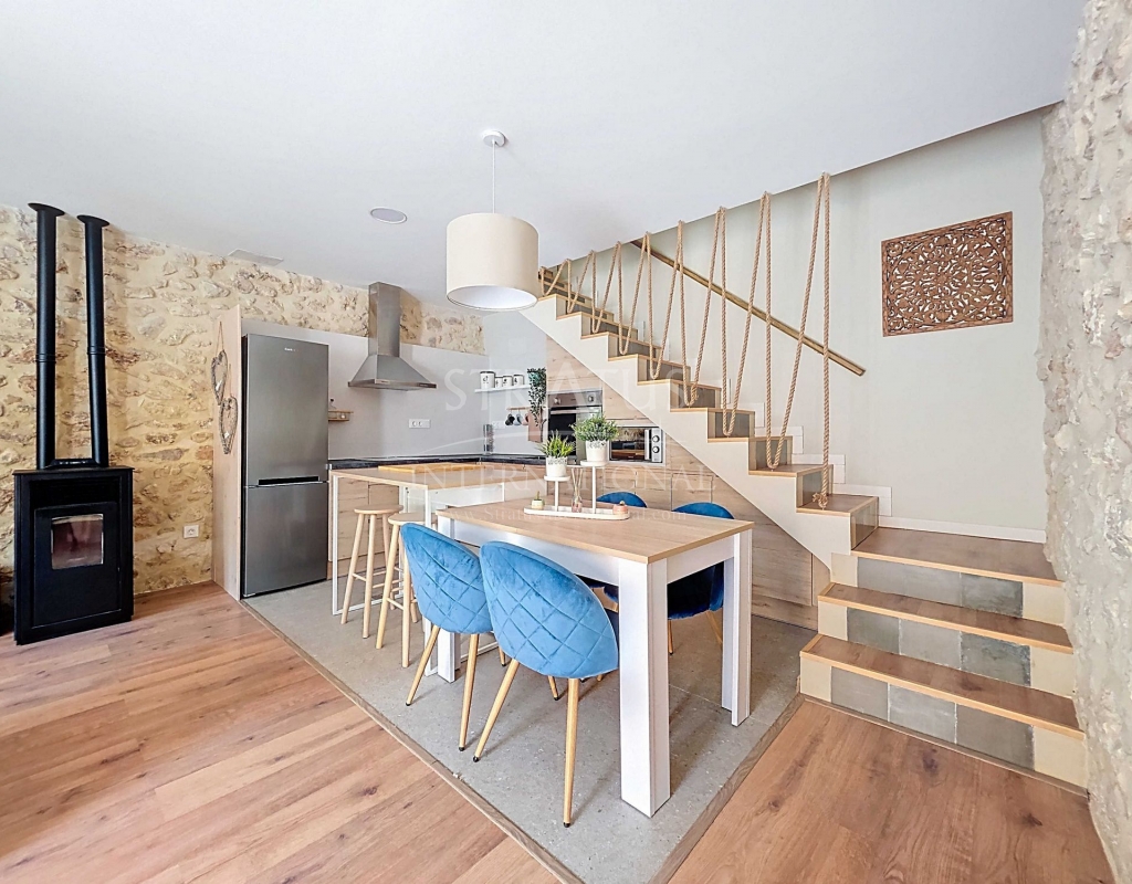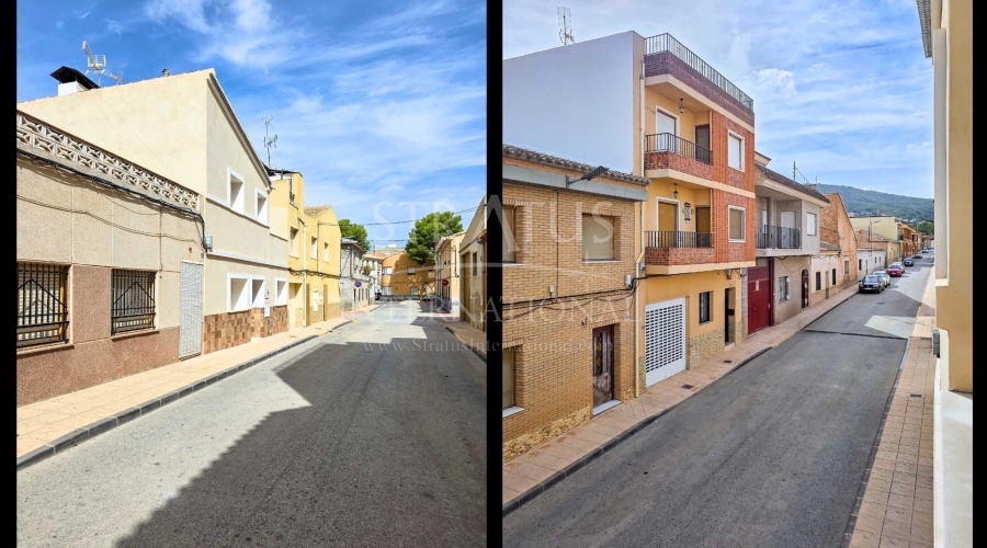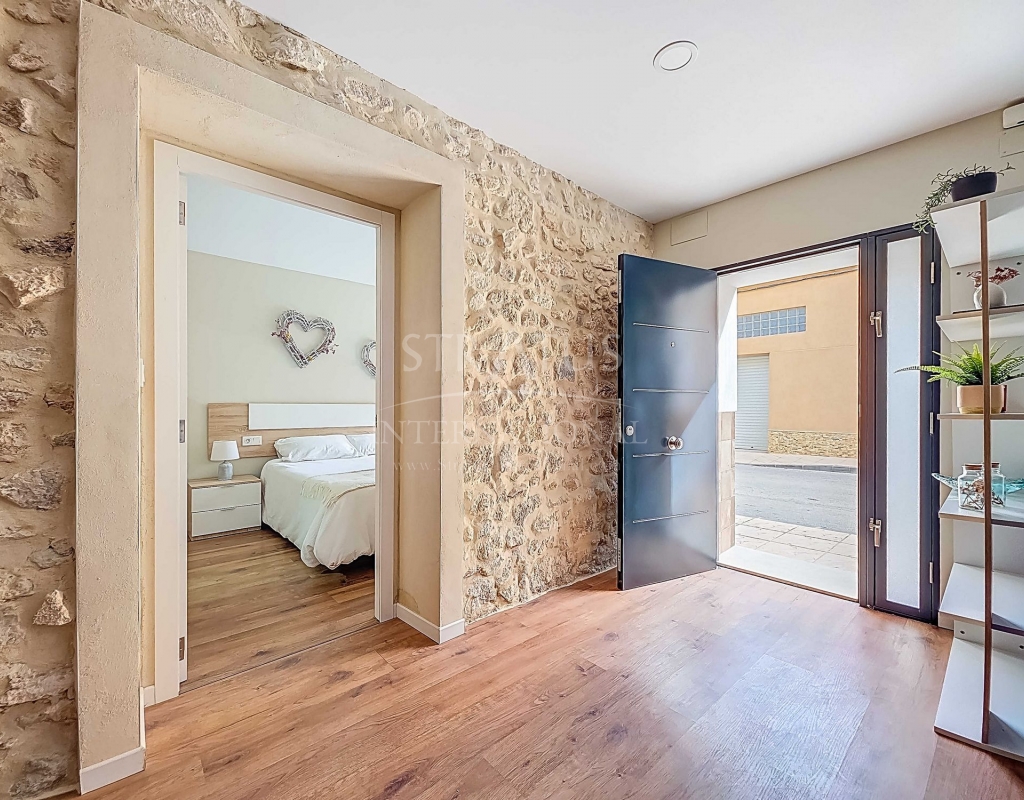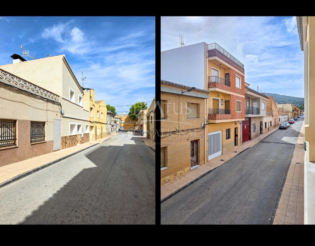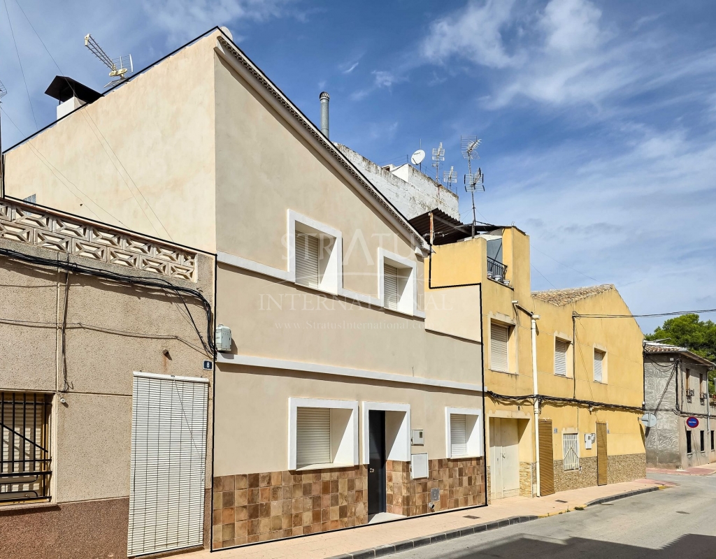 Fully Renovated Two-Storey Village House with Rooftop Terrace in Pinoso This property is listed exclusively, which means all documents have been checked in advance and everything is either in order or can be arranged. Move-in ready, stylishly and thoughtfully renewed: this two-storey village home combines modern living with authentic Spanish charm. Perfectly located in the heart of Pinoso, with all amenities within walking distance. The spacious rooftop terrace is the ideal spot to relax all year round under the Spanish sun. The property – ground floor Upon entering the living room with its open-plan, fully fitted kitchen, the welcoming atmosphere of the home is immediately clear. The finishes are modern, while authentic materials create a contemporary Spanish feel. A pellet stove in the living room enhances the warm and cosy ambiance. This floor also offers a bedroom with a luxurious en-suite bathroom featuring a walk-in shower. The area between the bedroom and bathroom includes built-in cupboards, creating generous storage space. The property – first floor This level includes two additional bedrooms and a bathroom with a walk-in shower. One of the bedrooms provides access to the spacious rooftop terrace, where the boiler is located and part of the space is covered. It’s the perfect place to enjoy sun or shade, paired with a glass of local wine and tapas. Features and recent upgrades The house is connected to mains electricity, water and sewage. Recent renovations include: Complete renewal of electrics and plumbing New ceilings with wooden beams New windows and frames with screens and shutters Fully renovated bathrooms Brand-new fitted kitchen with appliances New boiler Pellet stove with central heating (all rooms heated) Walls plastered and painted in Spanish style Bonus The beautiful furniture is included in the price, so the home is ready to move into immediately. Pinoso Pinoso offers all daily amenities including supermarkets, schools, a medical centre, sports facilities and a wide selection of restaurants. The area has many walking, hiking and cycling routes and is surrounded by almond, olive and vineyard landscapes. With a welcoming atmosphere, Pinoso provides the perfect balance between traditional Spanish culture, beautiful nature and modern conveniences – all in a pleasant Mediterranean climate. Both Alicante and Murcia airports, as well as the beaches, can be reached in under an hour. Contact us today to arrange a viewing and see for yourself everything this property has to offer.Features