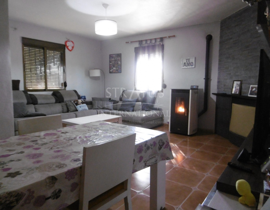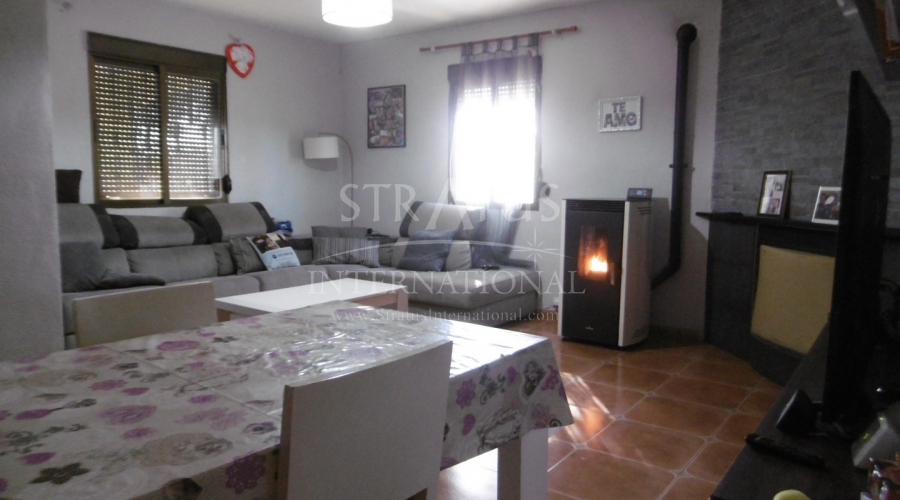 The home offers 3 bedrooms, one bathroom, a separate toilet, an independent kitchen, and a spacious dining/living room complete with a wood-burning fireplace and a pellet stove, creating a cosy atmosphere year-round. The floors are finished with durable ceramic tiles throughout.