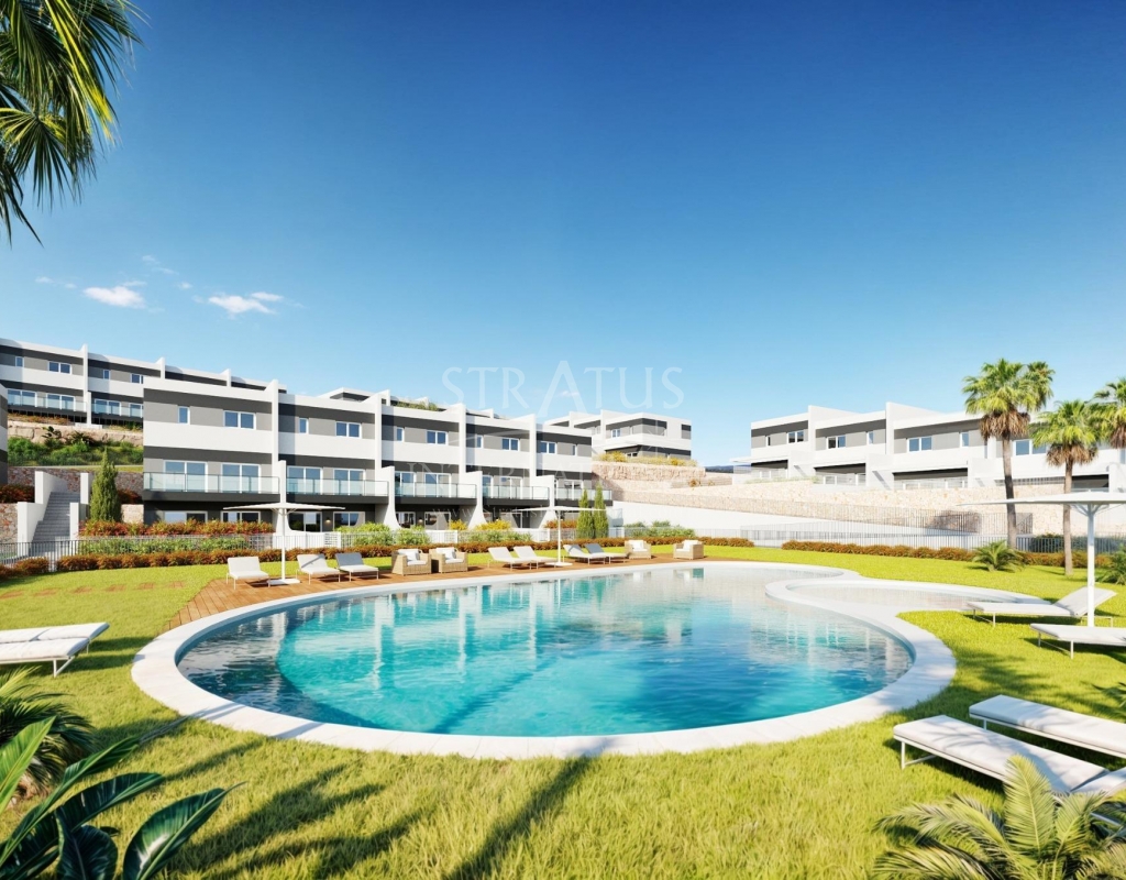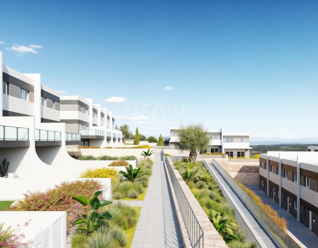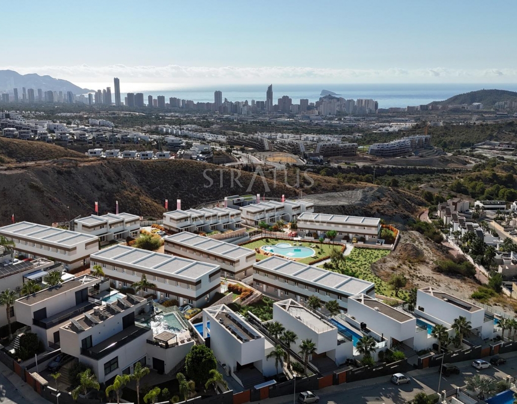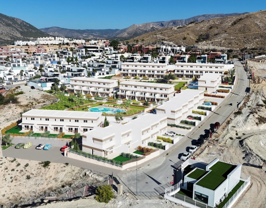Modern 3 Bedroom Townhouses for Sale in Balcon de Finestrat Costa Blanca Contemporary Homes in a Prime Mediterranean Location This new residential development of 3 bedroom, 2 bathroom and 1 guest toilet townhouses is located in Balcon de Finestrat, a peaceful and well maintained area on the Costa Blanca. Just minutes from Benidorm and next to the Puig Campana Golf Course, this location offers an ideal balance of nature, sea and essential services. The area is known for its beautiful mountain scenery, easy access to leisure areas and a pleasant climate throughout the year. Modern Design with Bright and Functional Interiors The townhouses feature a modern open plan layout. The ground floor integrates a spacious kitchen, dining and living area filled with natural light, as well as a guest toilet. On the upper floor, the double bedrooms and fully equipped bathrooms provide comfort and privacy for the whole family. Some units include a 50 m2 basement with pre installation for an additional bathroom and an open space that owners can customize, with direct access to the garden. Outdoor Spaces Designed for Mediterranean Living Each property offers generous terraces, ideal for enjoying the views of the natural surroundings and the sunny Costa Blanca weather. The community features a swimming pool, landscaped gardens and outdoor relaxation areas, creating a peaceful environment for residents. High Quality Finishes and Energy Efficiency Homes include fully fitted bathrooms with furniture, mirror and shower screens, complete air conditioning installation, solar panels for electrical support, armored front door and Energy Certificate A. Basements come with pre installation for air conditioning splits. Excellent Connectivity and Nearby Services The sandy beaches of Benidorm and Villajoyosa are just 4 km away, and the La Marina shopping center is only a short drive, offering restaurants, shops and entertainment. Nearby you will find international schools, supermarkets and all daily amenities. Distances of interest: Alicante Airport 40 km, Puig Campana Golf Course 1 km, Benidorm beaches 4 km, Villajoyosa port 9 km. A Lifestyle of Comfort and Convenience Each property includes one or two private outdoor parking spaces, ensuring practicality and comfort year round. Contact us today to schedule a viewing and secure your new home in Balcon de Finestrat.Features