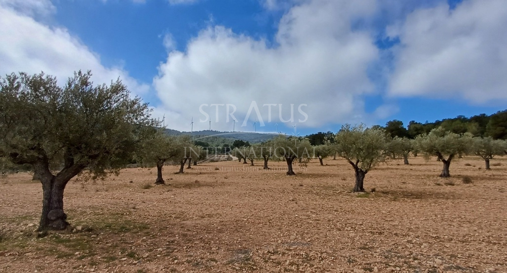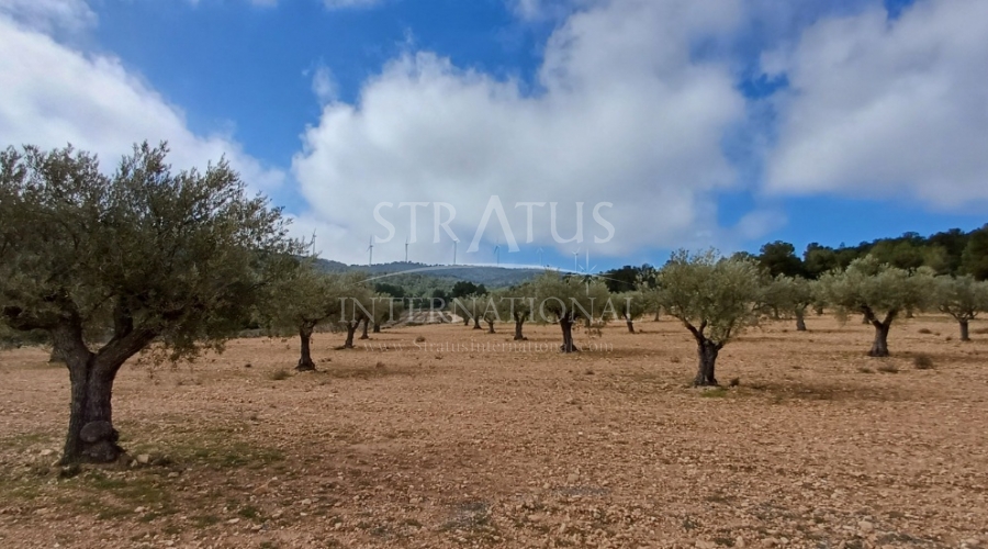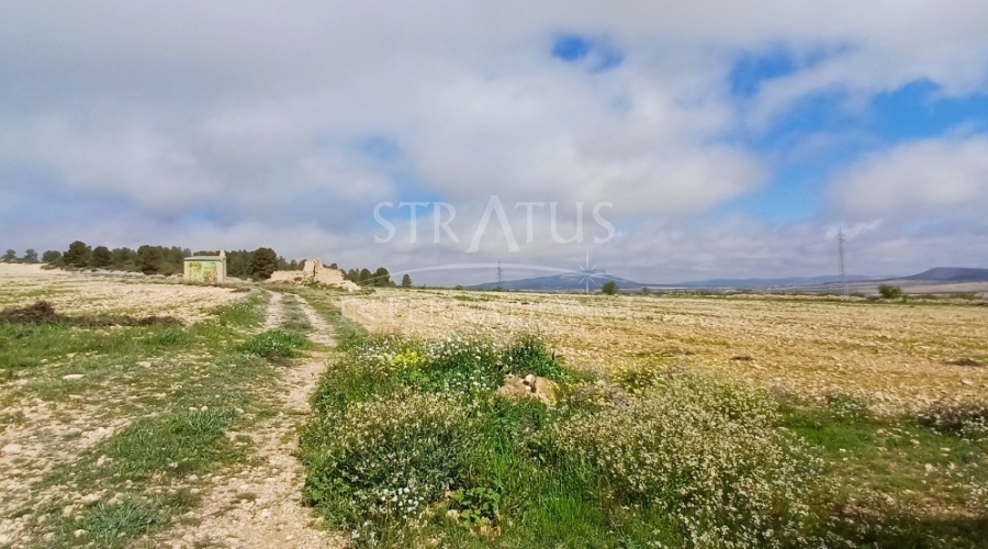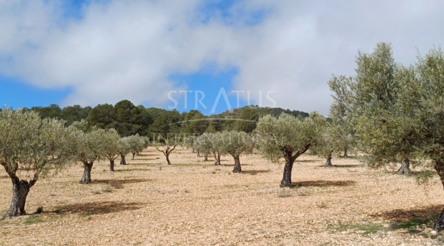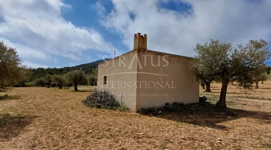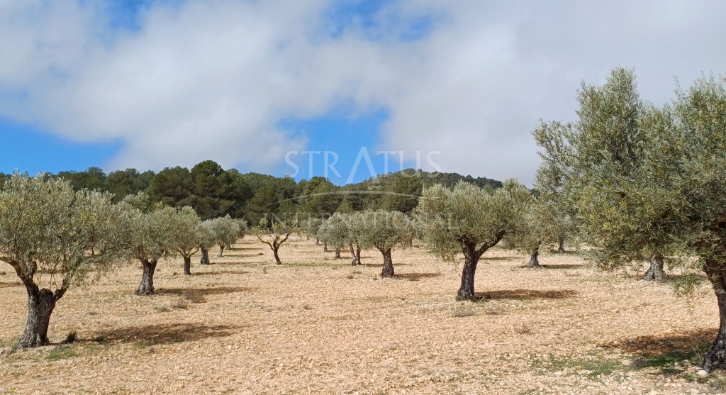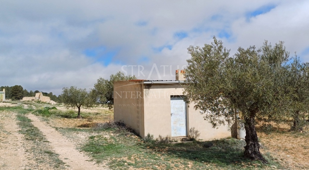 We bring you this building land of over 29000 m2 with a non-residential building - little agricultural warehouse - near Yecla. Located in a tranquil environment, surrounded by hills, forests, and orchards, offering great privacy and mountain views, this property allows you to build a large house in an off-grid, natural setting. The land is planted mostly by healthy, adult olive trees in production, while a smaller part has a vineyard for your agricultural ventures. The warehouse/shed of app. 30 m2, built from concrete blocks, is used as a storage.