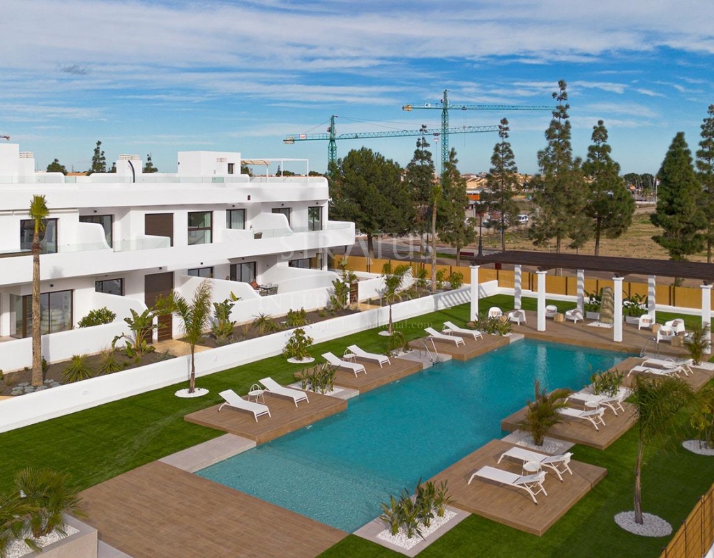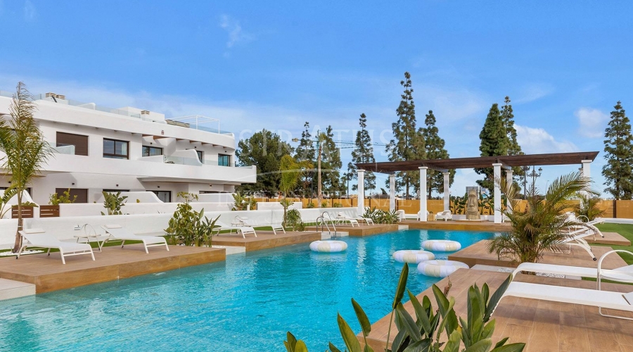 New Build Residential Complex Near Serena Golf and the Mar Menor in Los Alcazares Modern Coastal Living on the Costa Calida Discover this attractive new build residential complex located in Los Alcazares, one of the most popular seaside towns on the Costa Calida. Situated just 500 m from the beaches of the Mar Menor and within walking distance of the town center, this development offers an excellent combination of coastal living, golf surroundings and everyday convenience. Los Alcazares is well known for its relaxed atmosphere, long promenades, warm shallow waters and a wide range of restaurants, shops and services open all year round. Contemporary Apartments Designed for Comfort The development consists of 29 modern homes with 2 or 3 bedrooms, designed with clean architectural lines and high quality finishes. Buyers can choose between ground floor apartments with private garden and terrace, middle floor homes with spacious terraces, or penthouses with private terrace and rooftop solarium offering open views. Many of the properties enjoy views towards Serena Golf and the Mar Menor, creating a calm and pleasant living environment. All homes are designed to maximize natural light and functionality, making them ideal as a permanent residence, holiday home or investment property. High Quality Features and Communal Areas Each property includes a private parking space and a storage room. The specifications are designed to provide comfort and energy efficiency, including double glazed windows with thermal break, pre installation of ducted air conditioning, aerothermal system for domestic hot water, electric shutters in bedrooms and a complete interior and exterior lighting package. Bathrooms are delivered fully equipped with furniture, mirror and shower screen. Residents can enjoy attractive communal areas with landscaped gardens and a communal swimming pool, perfect for relaxing and enjoying the Mediterranean climate. Selected blocks are equipped with lifts for added convenience. Prime Location Between Golf and Sea This residential complex enjoys a privileged location next to Serena Golf, one of the most renowned golf courses in the area, and just a short walk from the calm waters of the Mar Menor. The area is ideal for swimming, sailing, paddleboarding and other water sports throughout the year. Key distances include Mar Menor beaches at 0.5 km, Serena Golf directly next to the development, Los Alcazares town center at 2 km, Cartagena at 22 km and Murcia city at 40 km. Murcia Corvera Airport is approximately 30 km away and Alicante Airport is around 90 km. An Ideal Home or Investment Opportunity With its excellent location, modern design and proximity to both golf and the sea, this new residential complex in Los Alcazares offers an outstanding lifestyle opportunity on the Costa Calida. Contact us today to receive more information or to arrange a private viewing and secure your new home by the Mar Menor.Features