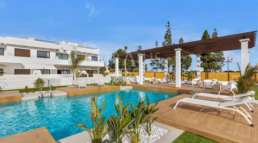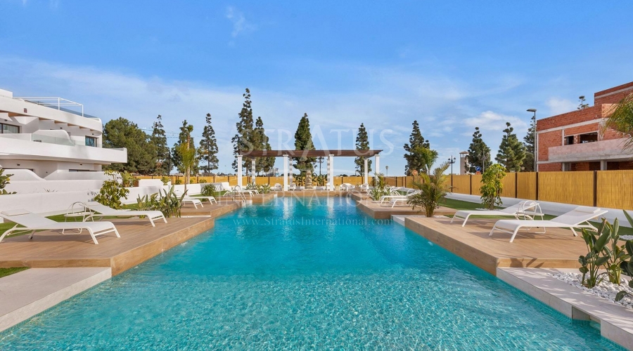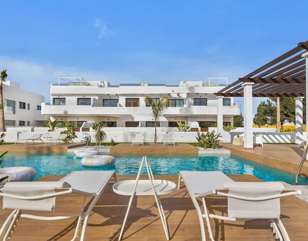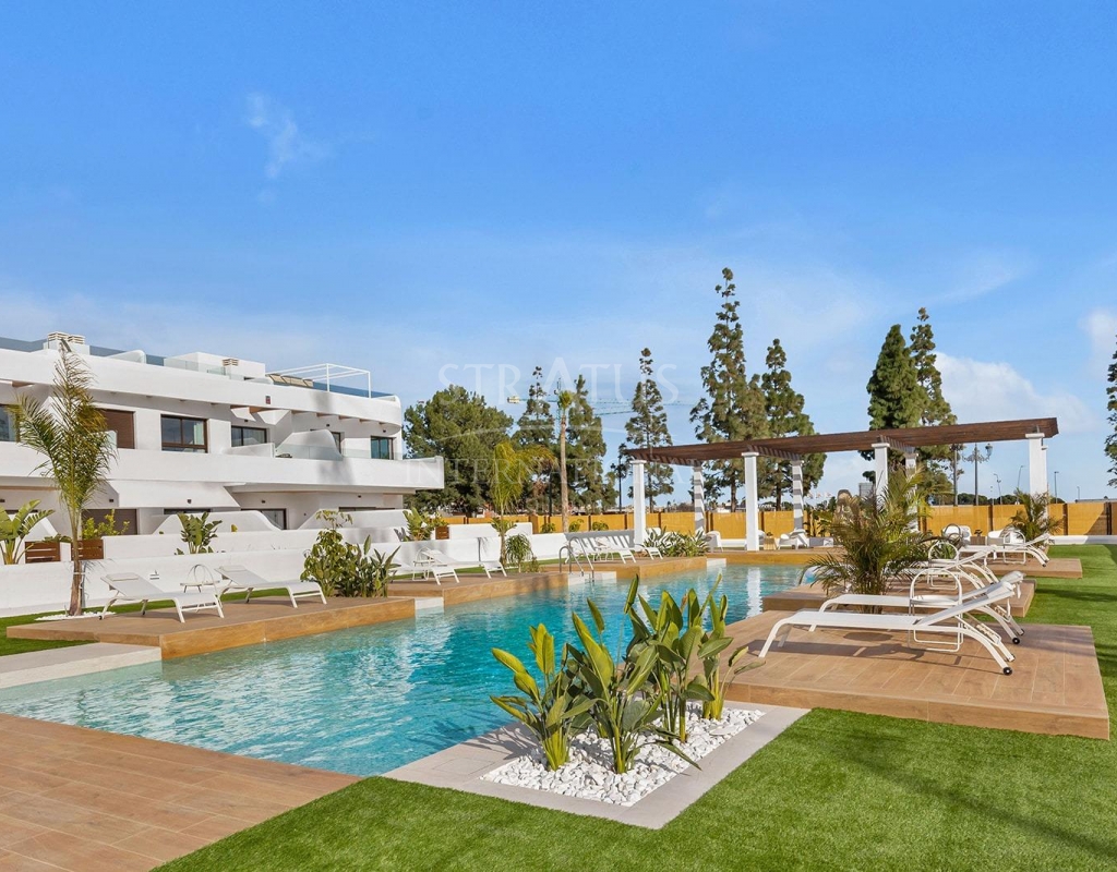 New Build Residential Complex Near Serena Golf and the Mar Menor in Los Alcazares Modern Coastal Living on the Costa Calida Discover this attractive new build residential complex located in Los Alcazares, one of the most popular seaside towns on the Costa Calida. Situated just 500 m from the beaches of the Mar Menor and within walking distance of the town center, this development offers an excellent combination of coastal living, golf surroundings and everyday convenience. Los Alcazares is well known for its relaxed atmosphere, long promenades, warm shallow waters and a wide range of restaurants, shops and services open all year round. Contemporary Apartments Designed for Comfort The development consists of 29 modern homes with 2 or 3 bedrooms, designed with clean architectural lines and high quality finishes. Buyers can choose between ground floor apartments with private garden and terrace, middle floor homes with spacious terraces, or penthouses with private terrace and rooftop solarium offering open views. Many of the properties enjoy views towards Serena Golf and the Mar Menor, creating a calm and pleasant living environment. All homes are designed to maximize natural light and functionality, making them ideal as a permanent residence, holiday home or investment property. High Quality Features and Communal Areas Each property includes a private parking space and a storage room. The specifications are designed to provide comfort and energy efficiency, including double glazed windows with thermal break, pre installation of ducted air conditioning, aerothermal system for domestic hot water, electric shutters in bedrooms and a complete interior and exterior lighting package. Bathrooms are delivered fully equipped with furniture, mirror and shower screen. Residents can enjoy attractive communal areas with landscaped gardens and a communal swimming pool, perfect for relaxing and enjoying the Mediterranean climate. Selected blocks are equipped with lifts for added convenience. Prime Location Between Golf and Sea This residential complex enjoys a privileged location next to Serena Golf, one of the most renowned golf courses in the area, and just a short walk from the calm waters of the Mar Menor. The area is ideal for swimming, sailing, paddleboarding and other water sports throughout the year. Key distances include Mar Menor beaches at 0.5 km, Serena Golf directly next to the development, Los Alcazares town center at 2 km, Cartagena at 22 km and Murcia city at 40 km. Murcia Corvera Airport is approximately 30 km away and Alicante Airport is around 90 km. An Ideal Home or Investment Opportunity With its excellent location, modern design and proximity to both golf and the sea, this new residential complex in Los Alcazares offers an outstanding lifestyle opportunity on the Costa Calida. Contact us today to receive more information or to arrange a private viewing and secure your new home by the Mar Menor.Features