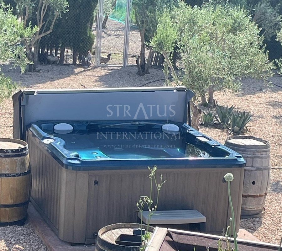 Outside, the property offers excellent facilities, including a 5x7 m swimming pool, a 6-person jacuzzi, several storage outbuildings, a tool shed and a wooden storage cabin surrounded by its own fenced garden with real grass and fruit trees. Behind the house is a detached guest studio with its own entrance, bedroom and ensuite bathroom—ideal for visitors or extended family.