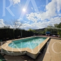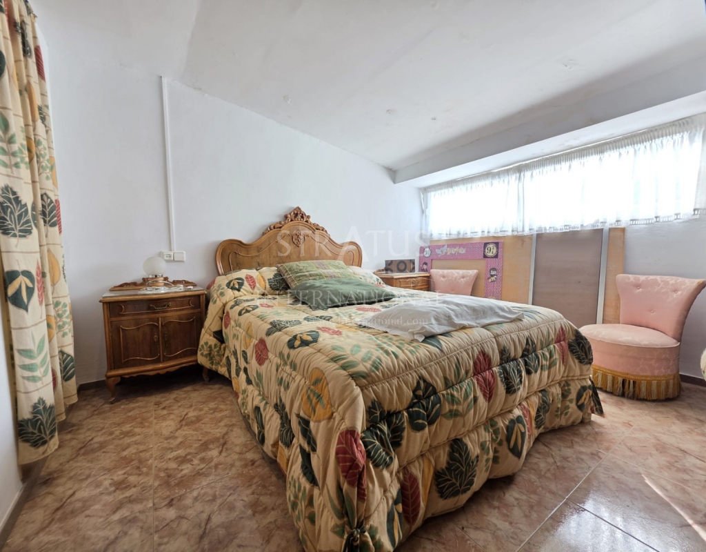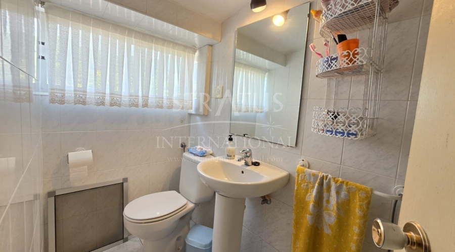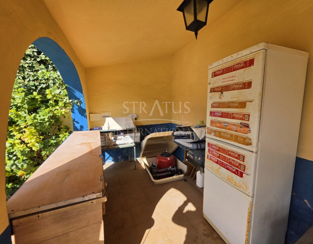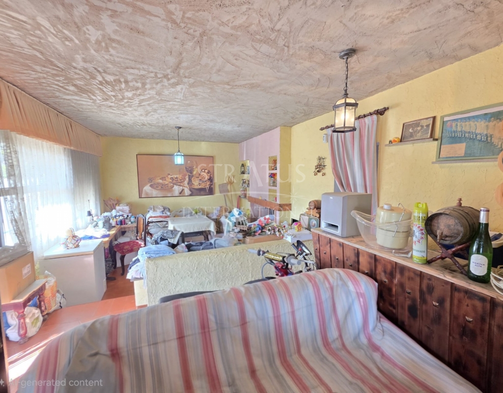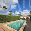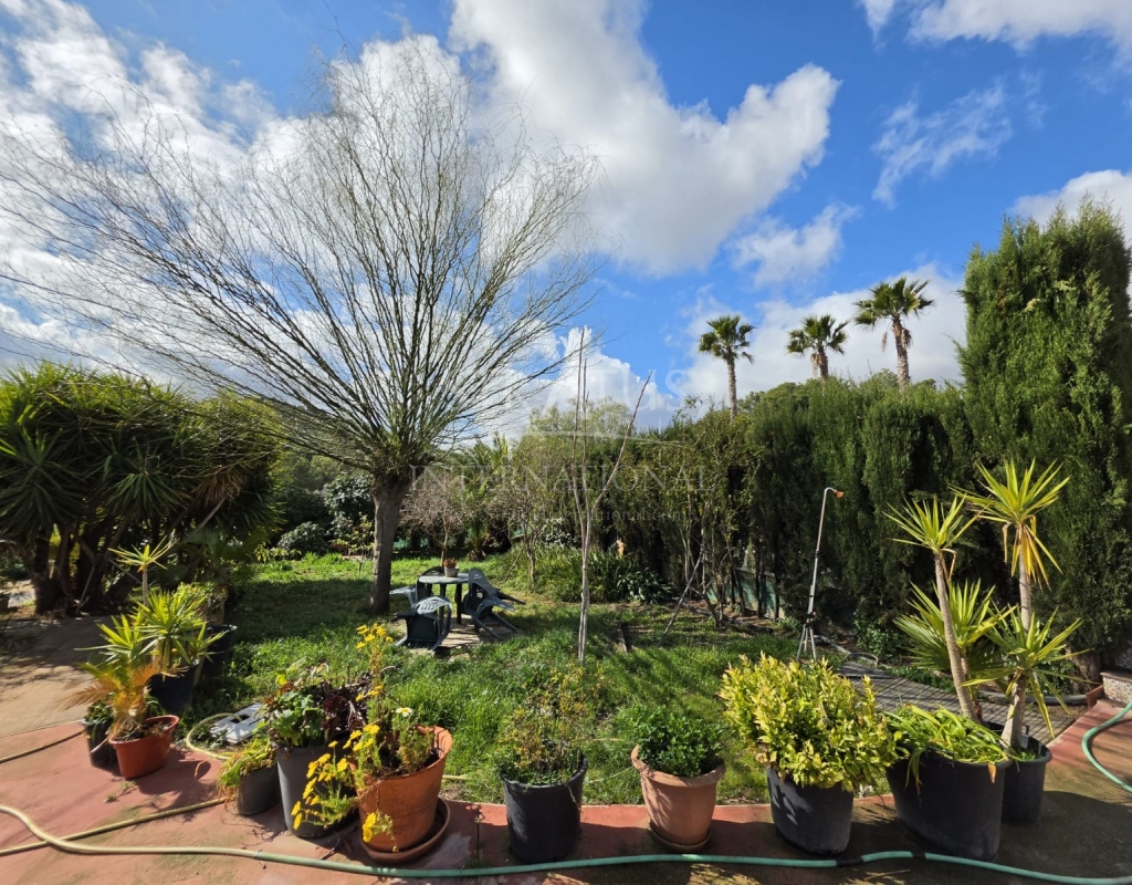 The villa sits on a fully fenced plot with a landscaped garden that includes outdoor lighting, creating a pleasant setting both during the day and in the evening. Outside, you will find a private swimming pool, ideal for enjoying the warm climate, as well as a garage with space for two cars. The property is connected to mains water and electricity, ensuring convenience for year-round living.