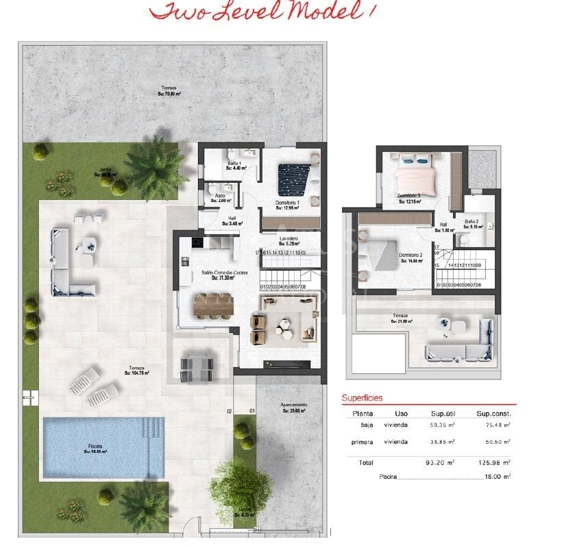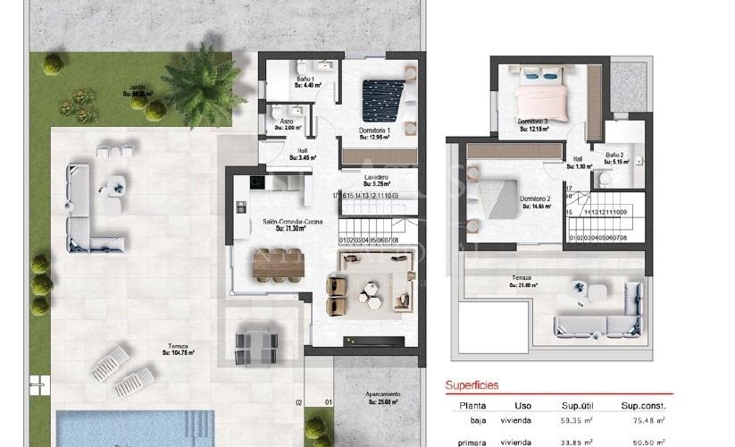 New Build Villas in Altaona Golf Resort Murcia with Private Pool and Mountain Views Contemporary Villas in Altaona Golf Resort Murcia Discover an exclusive new development of modern villas located in Altaona Golf Resort, one of the most attractive residential areas in Murcia. Surrounded by natural landscapes and mountains, this secure golf resort offers a peaceful environment while being just a short drive from the city of Murcia and the Mediterranean coast. These new build villas are designed to provide comfort, privacy and a relaxed Mediterranean lifestyle. The development offers a selection of villas on one level with optional solarium or two level layouts, all featuring three bedrooms and two bathrooms, including a master bedroom with en suite bathroom. Spacious Design with Private Gardens and Pool Each villa is built on a private plot starting from 300 m2, offering ample outdoor space to enjoy the sunshine all year round. The properties include a private swimming pool, landscaped garden areas and on plot parking. The interior layout is designed to maximize natural light and create a seamless connection between indoor and outdoor living. Open plan living and dining areas connect directly to the terrace and pool, creating the perfect setting for relaxing or entertaining family and friends. Quality Finishes and Modern Features These villas are built using high quality materials and modern construction techniques to ensure comfort and energy efficiency. Features include a reinforced security entrance door, fully fitted kitchen with appliances, underfloor heating in bathrooms and interior LED lighting package. Additional specifications include pre installation for ducted air conditioning and hot water production via an energy efficient aerothermal system, providing both sustainability and cost savings. Prime Location Close to Golf, City and Coast Altaona Golf Resort is known for its 18 hole golf course, peaceful surroundings and excellent security, making it ideal for both permanent living and holiday homes. The resort offers a unique combination of nature, sport and proximity to key destinations. Murcia city center is located just 15 km away, offering a wide range of shops, restaurants, cultural attractions and services. The beaches of the Mar Menor and the Mediterranean coast are approximately 20 km away, perfect for enjoying sunny days by the sea. Other key distances include Murcia Corvera Airport 15 km, Cartagena city 35 km and several golf courses within a short drive, making this an ideal location for golf lovers and international buyers. Ideal Investment and Mediterranean Lifestyle Opportunity These new build villas in Altaona Golf Resort offer an excellent opportunity to enjoy a high quality lifestyle in a natural and secure environment, with easy access to both the city and the coast. Contact us today for more information or to arrange a viewing and discover your new home in Murcia.Features